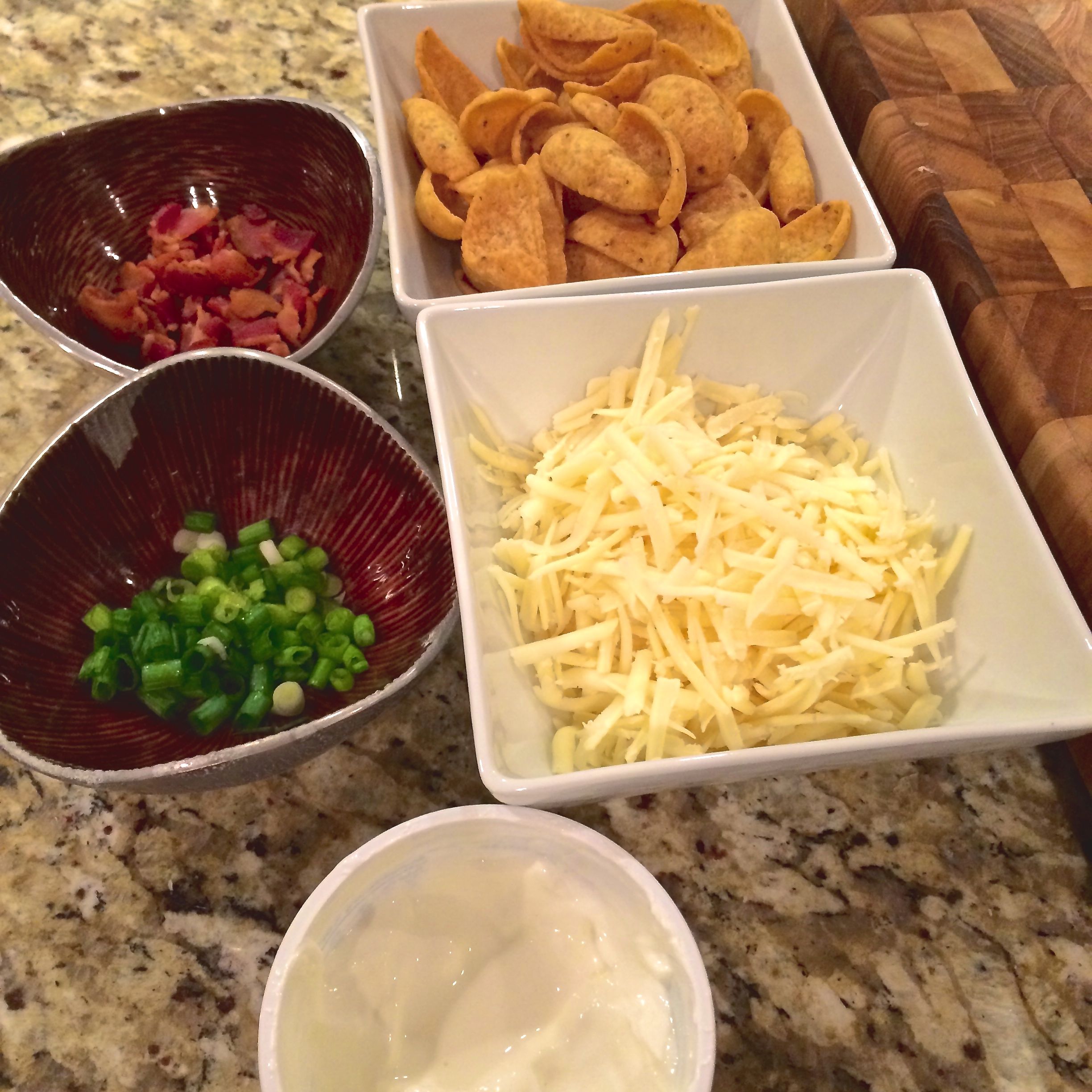 - Toppings!!: ALL the corn chips, lime, sour cream or greek yogurt, shredded cheese, scallions, and the reserved bacon