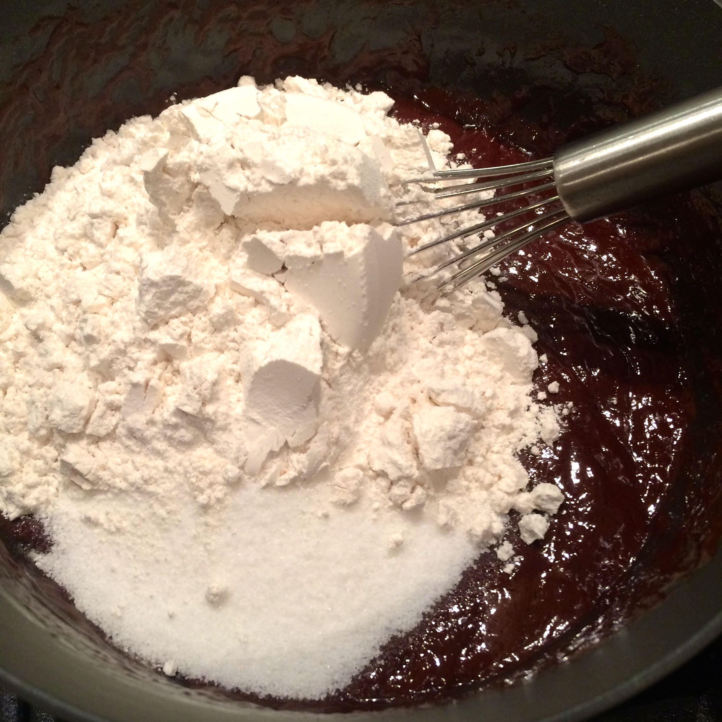 Once mixture is mostly cooled, and add in eggs, one at a time. Mix until combined.