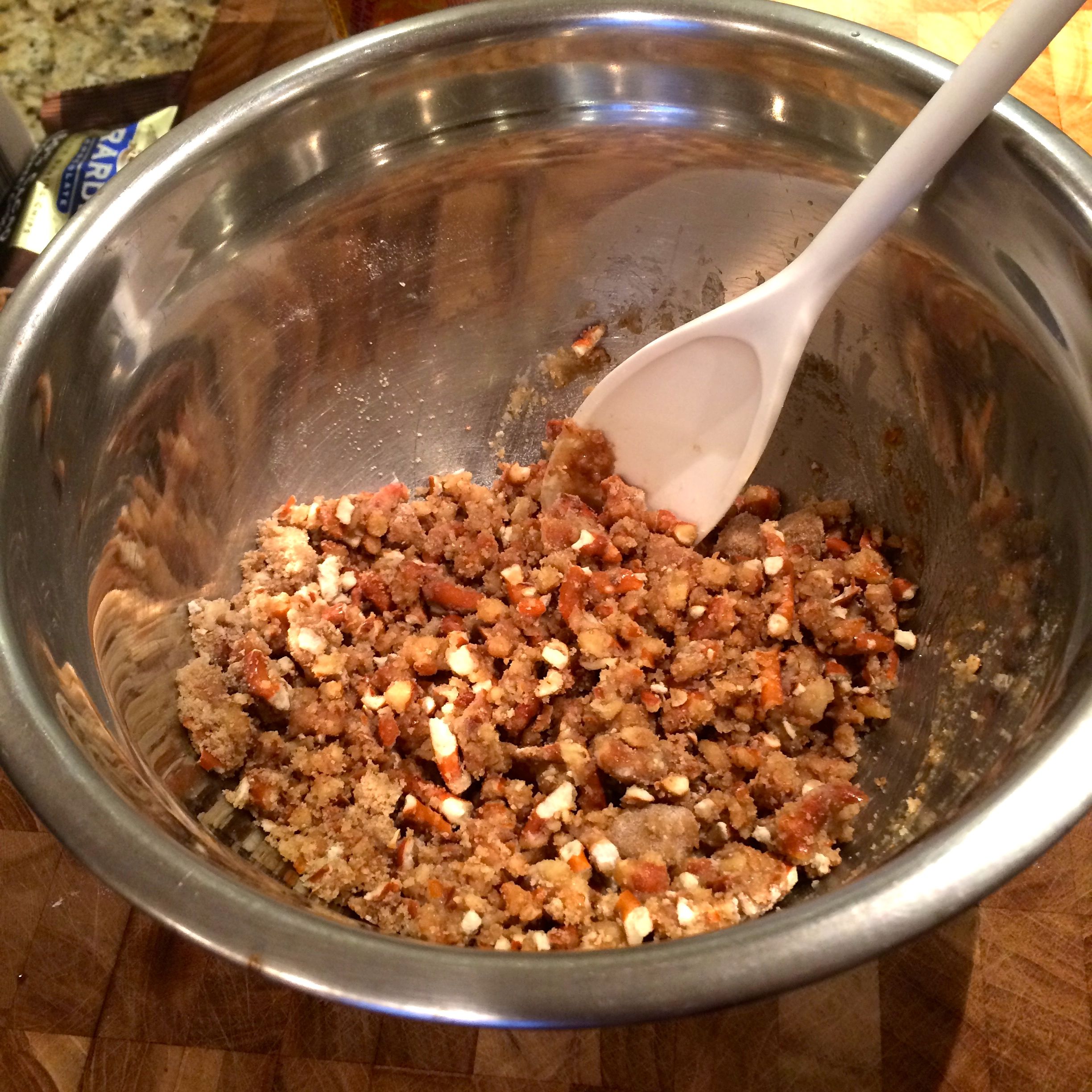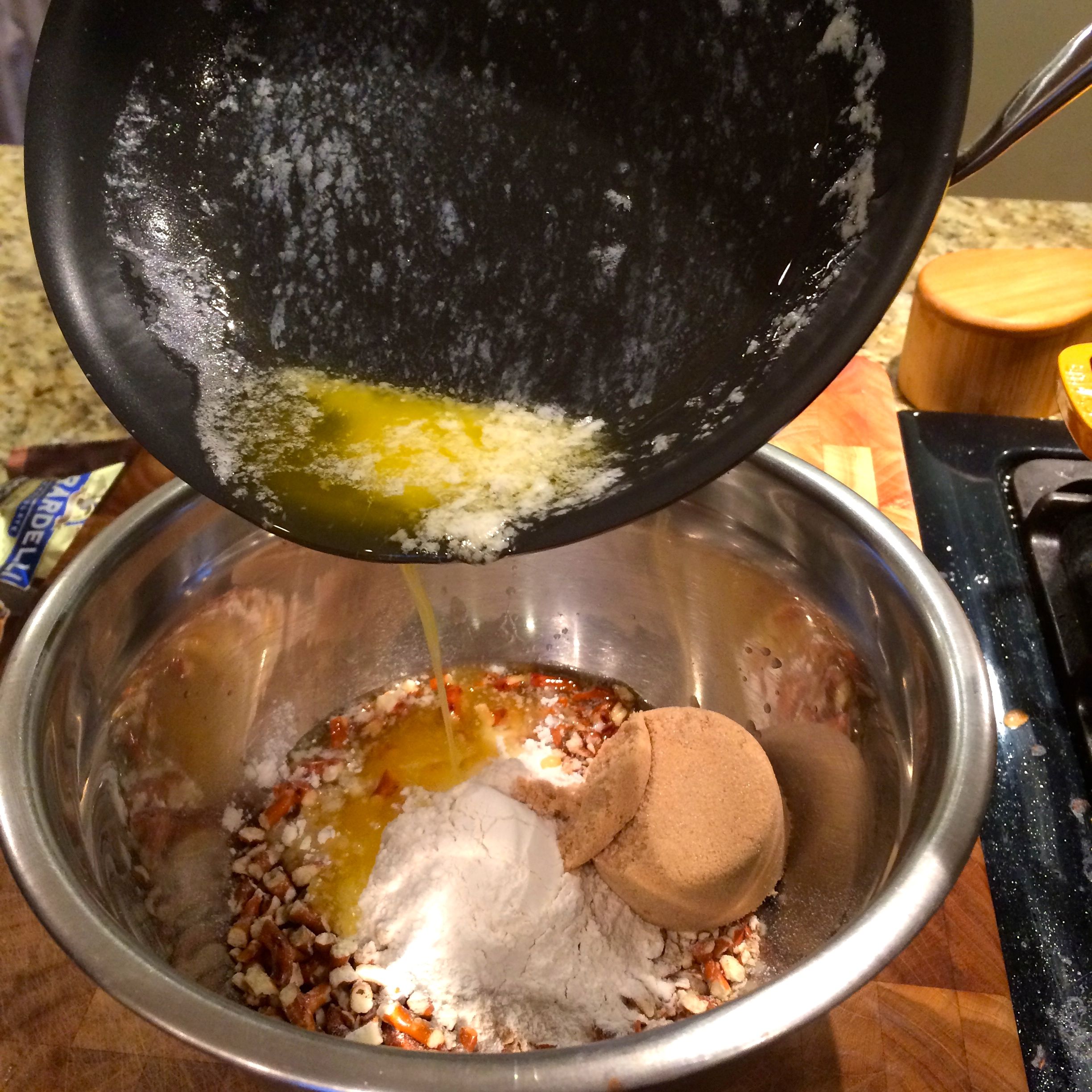 To form the crust, mix the pretzels, flour, brown sugar, baking soda, and butter together.