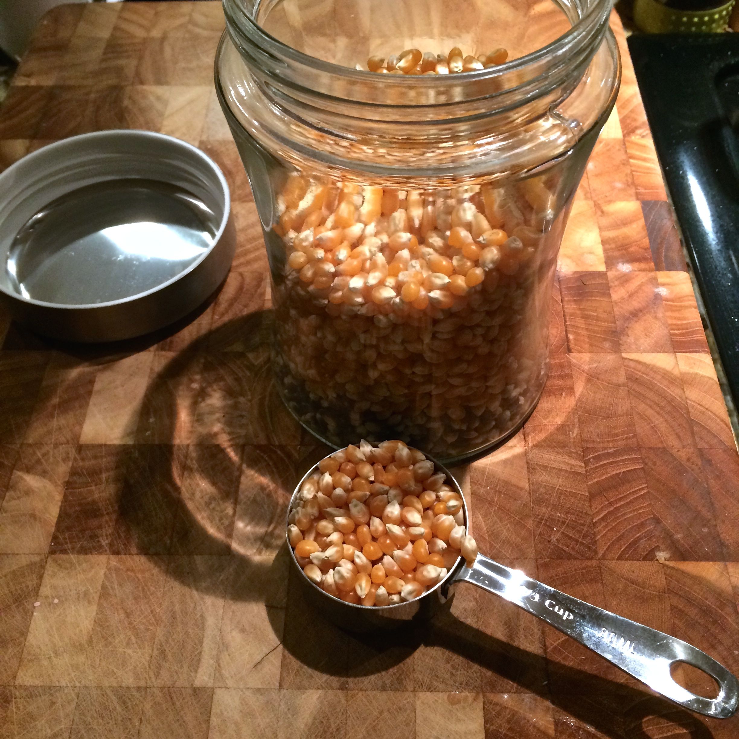- 1/3-1/2 cup popcorn kernels (1/3 cup = 11 cups popped popcorn, 1/2 cup = 16 cups popped popcorn)