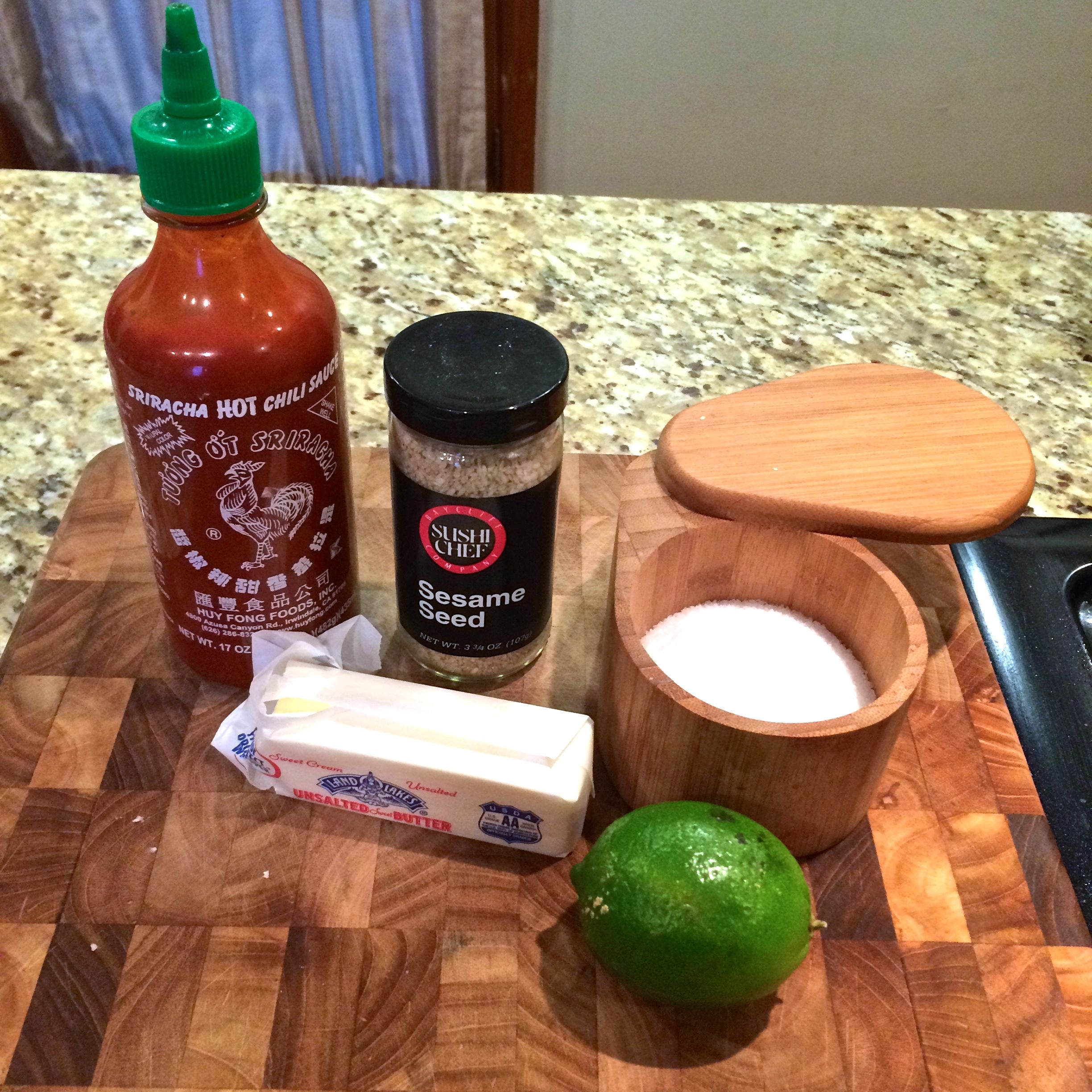 Melt the butter and sesame oil on the stove (or in the microwave). Remove from heat and pour into a small bowl. Add in the sriracha, lime zest, salt and sesame seeds and mix together.