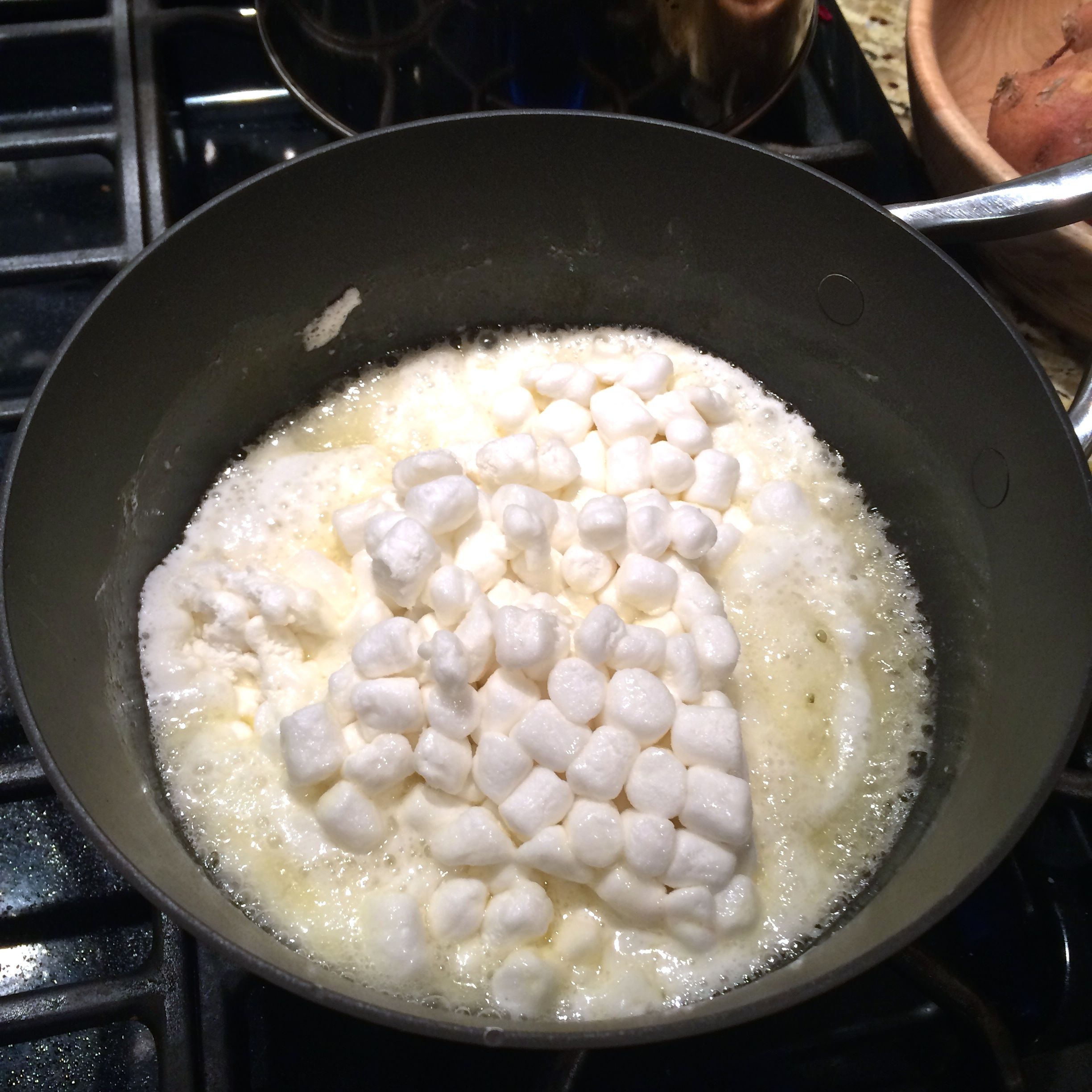 Over medium-high heat in a medium sized pot, melt the butter. Add in the mini marshmallows and heat (stirring frequently) until fully melted.