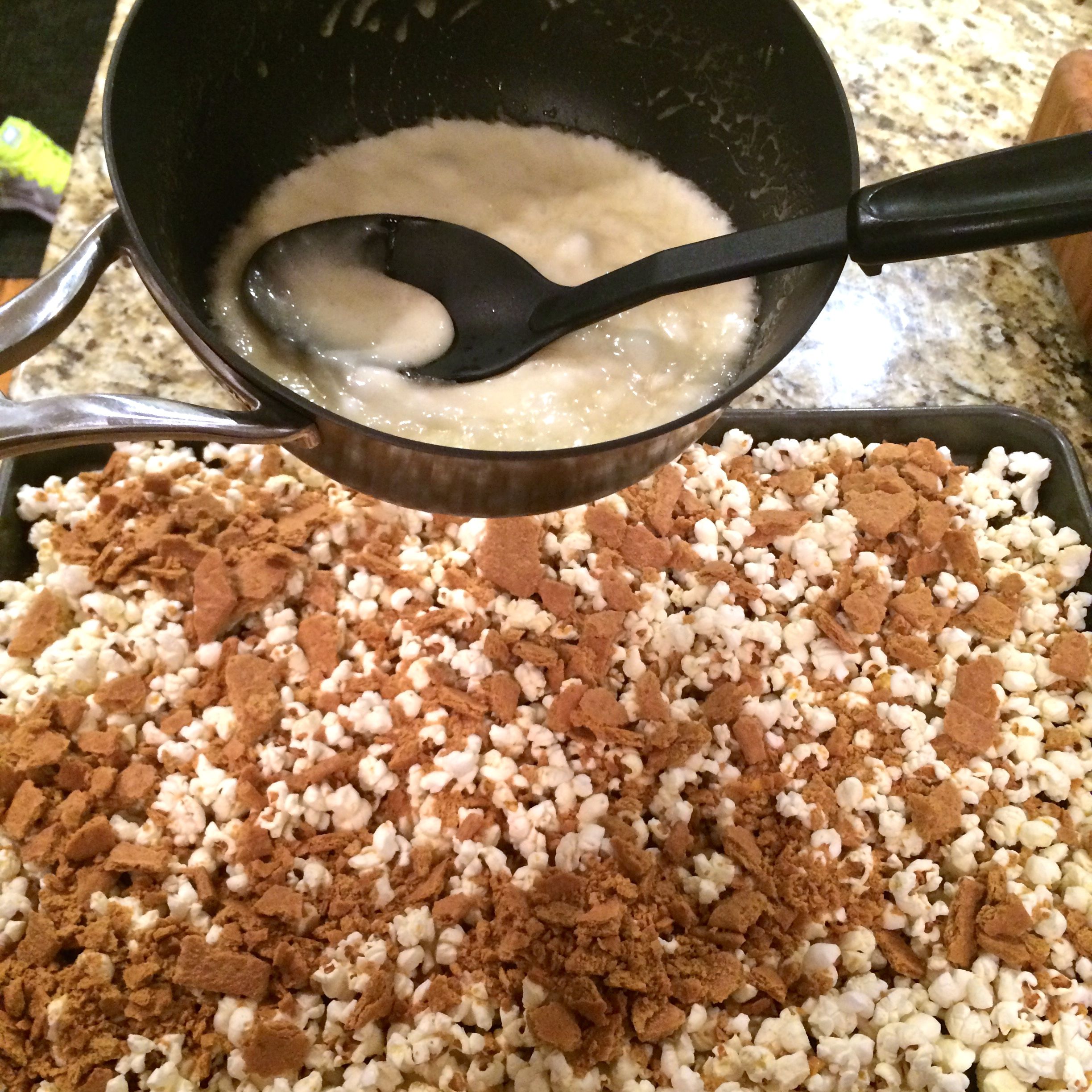 Place the popcorn on a sheet tray and top with the crushed graham crackers. Pour the marshmallow mixture over the top.