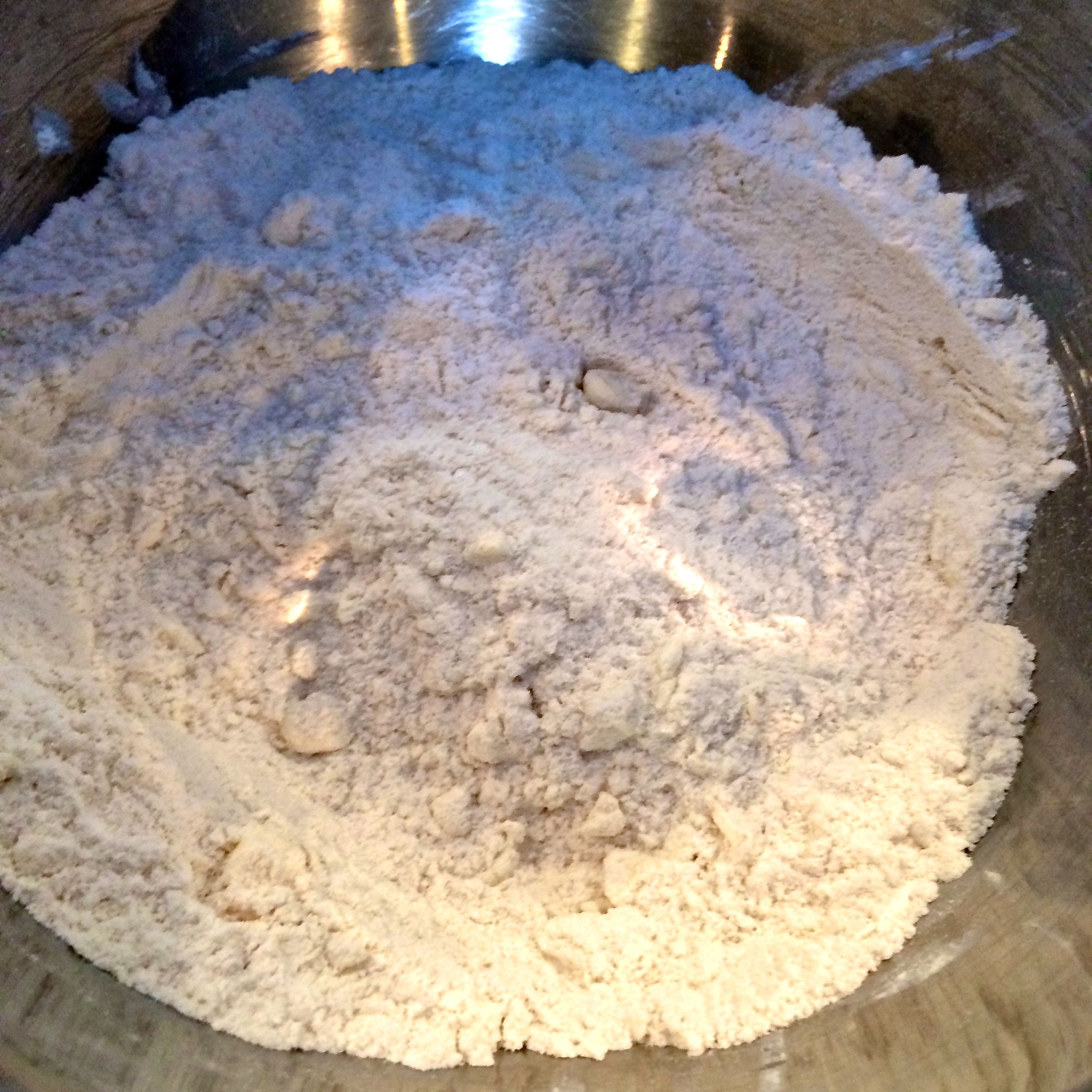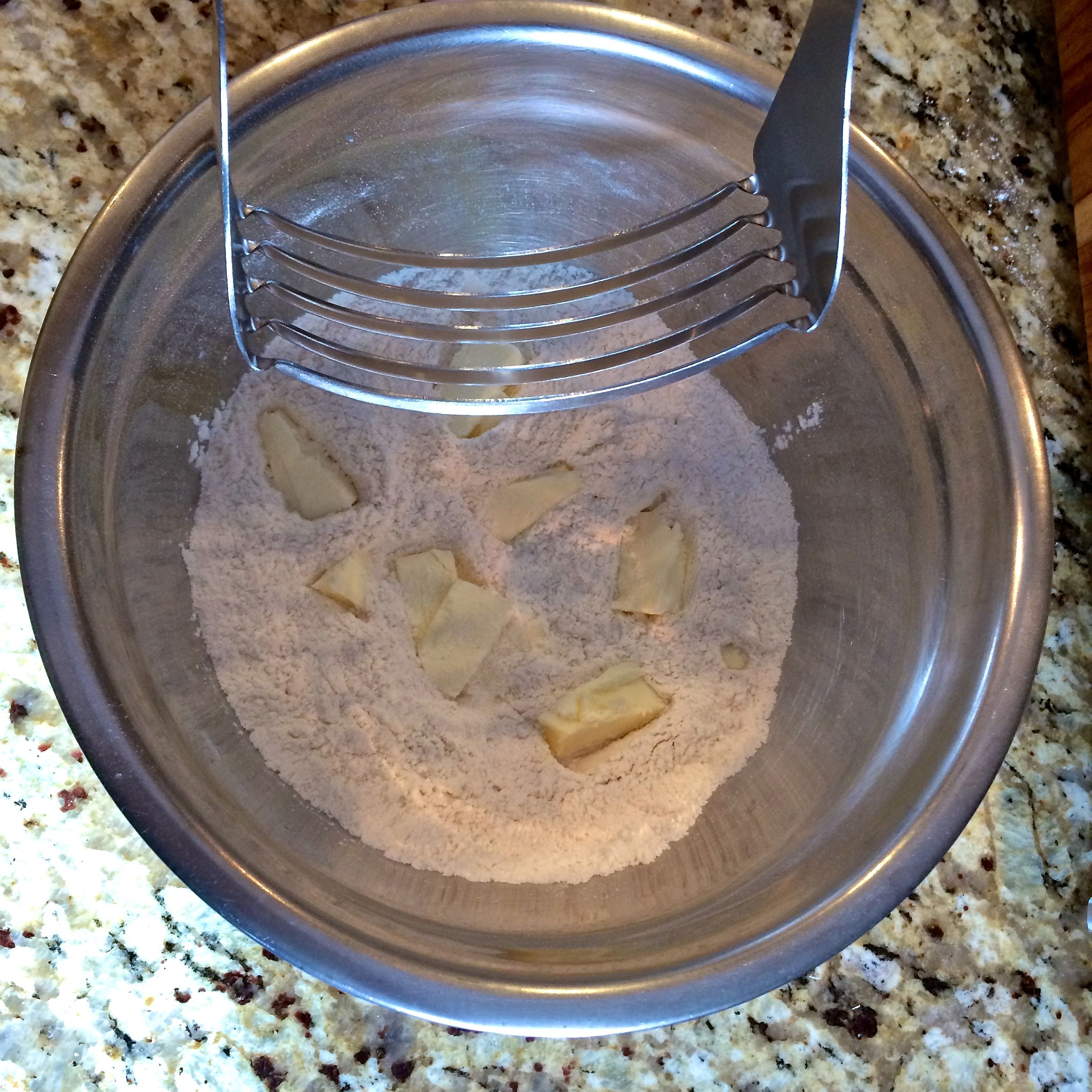 With a pastry cutter (or your hands), combine the butter into the flour until you get a coarse mixture. Don’t overwork it. Once the butter is incorporated fairly evenly into the flour, you’re good.