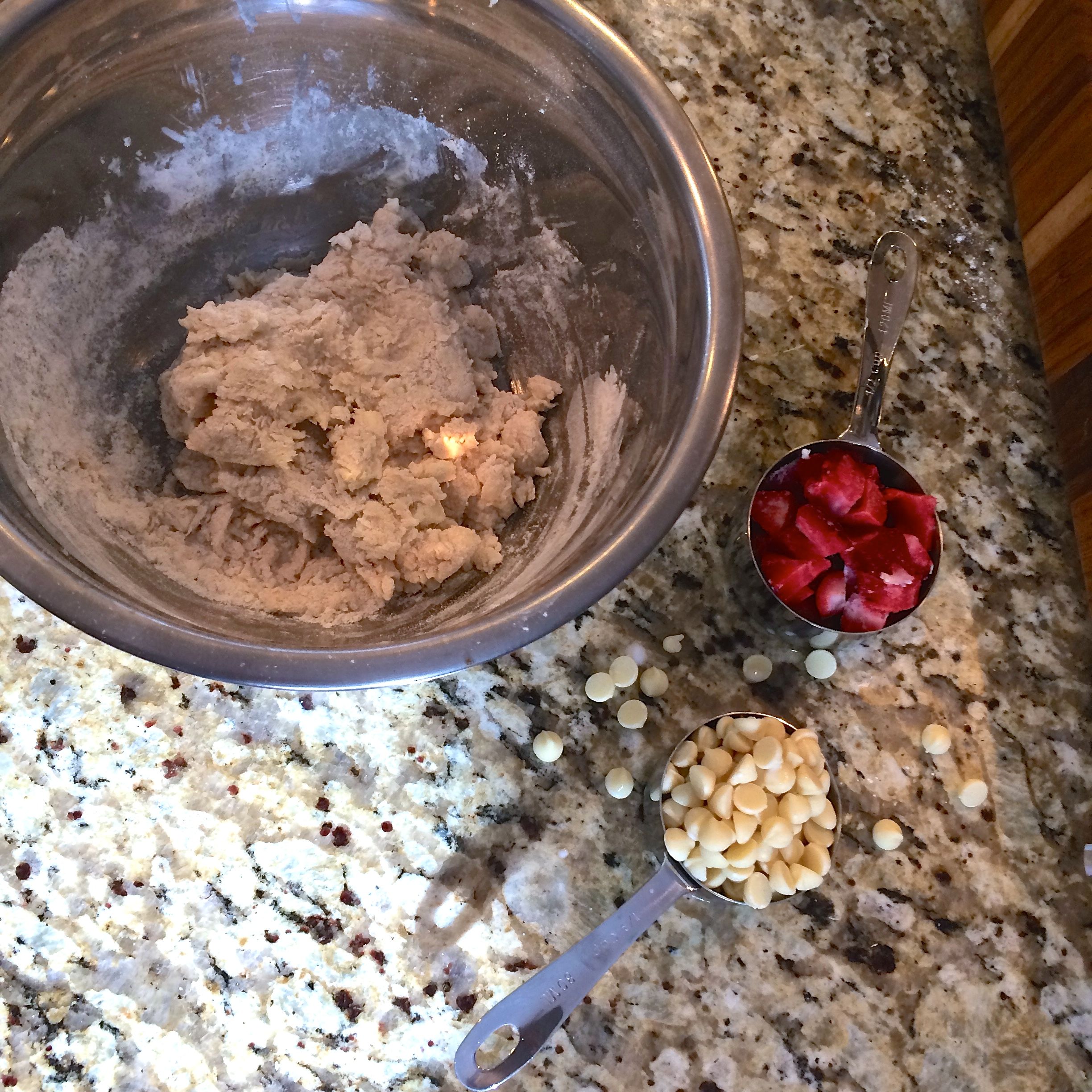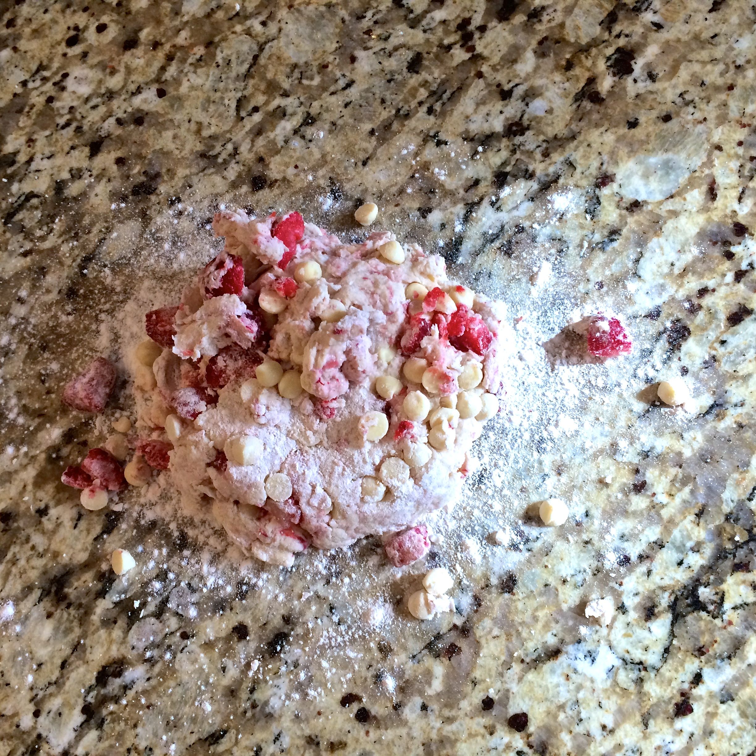 Now, toss in the strawberries and chocolate chips, and use your hands to fold them into the dough. Once everything is mostly combined, dump the dough onto a floured surface.