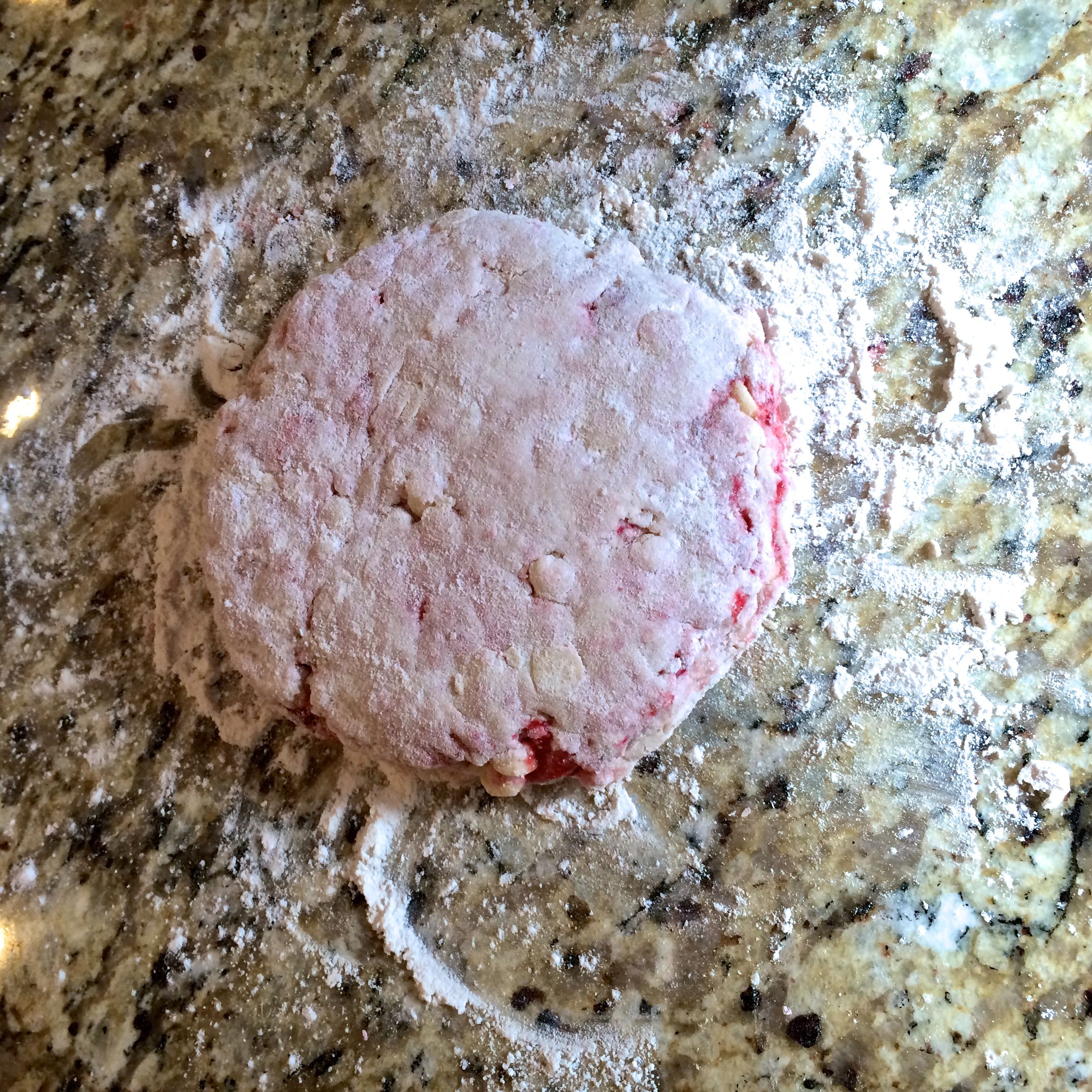 Get your hands coated in flour, and knead the dough for a minute or two, folding as you knead (which will result in beautiful flaky layers in the scones). Once together as a uniform dough, shape into a disc.