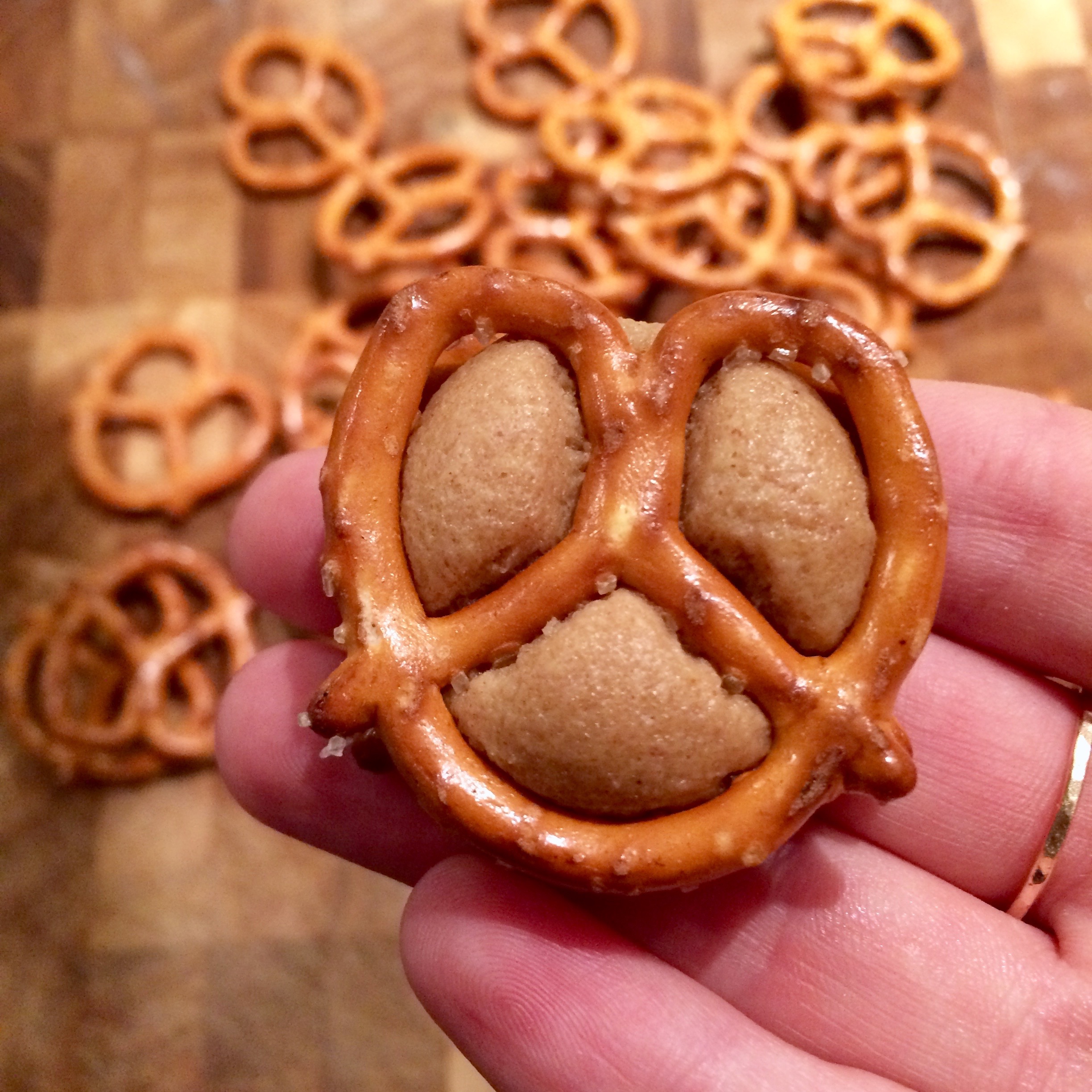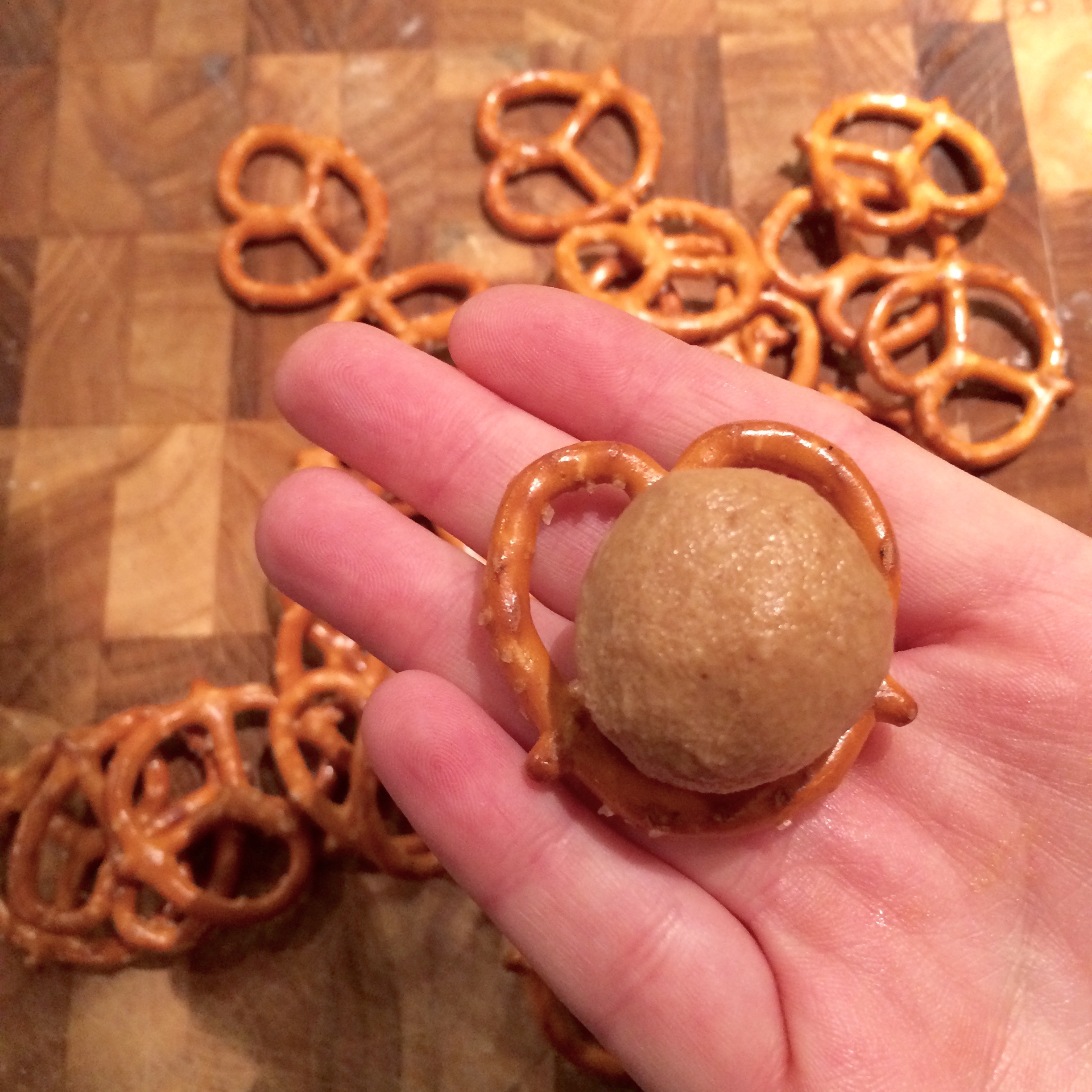 Take the peanut butter ball and smoosh it between 2 mini pretzels.