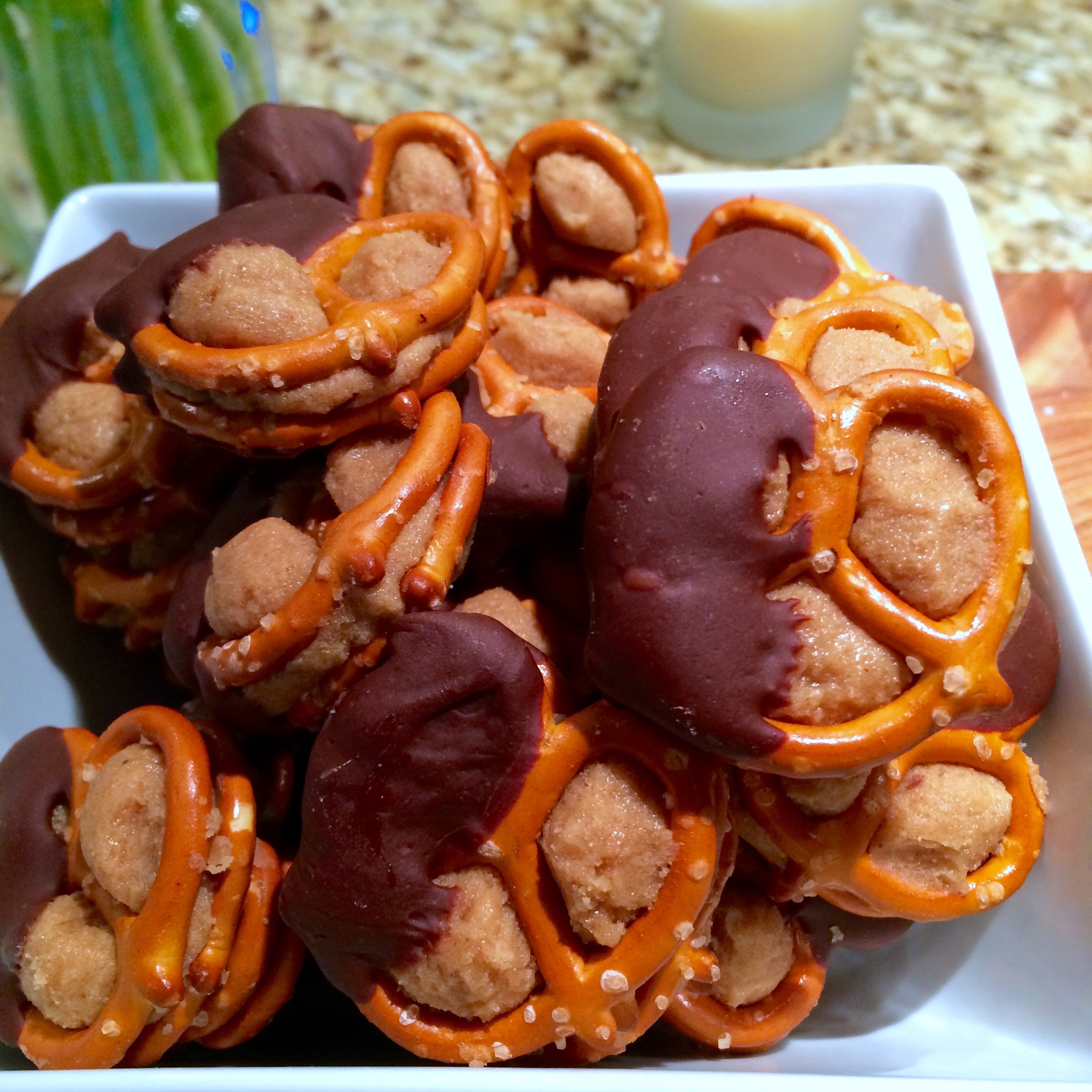When the chocolate is melted, take each pretzel sandwich and dip half into the chocolate. Place back onto the sheet tray. Continue until all sandwiches have been dipped, and place into the fridge or freezer until the chocolate has hardened.
