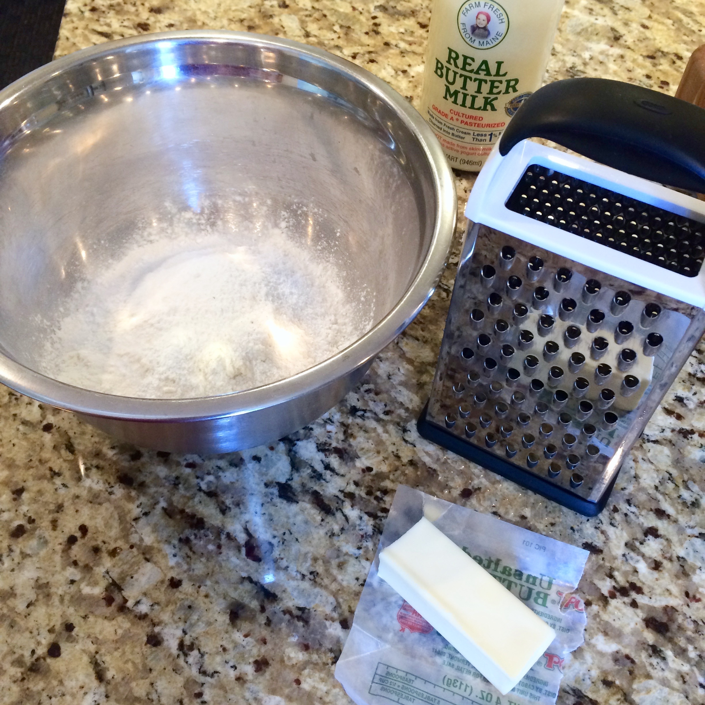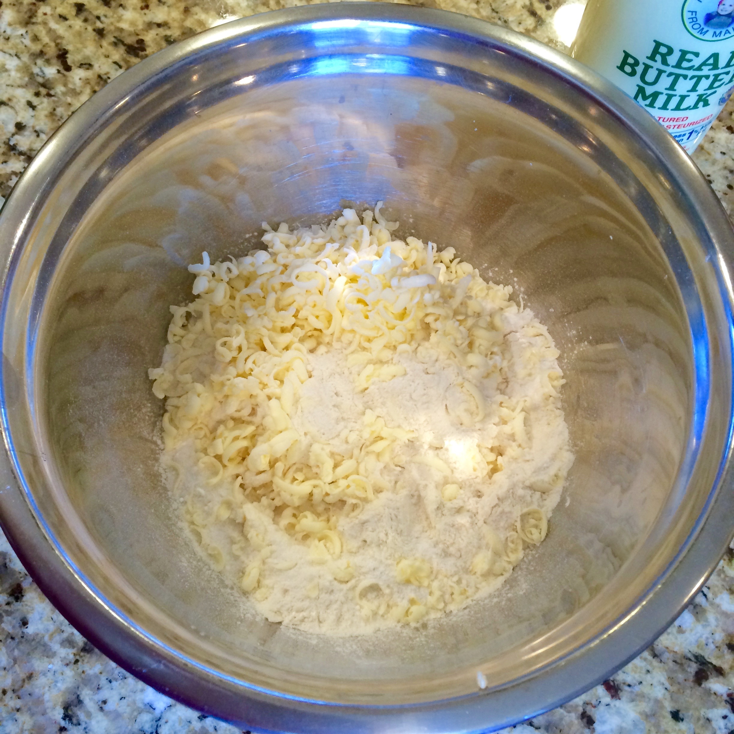 Grate the frozen butter into the dry mix. You can also use refrigerated butter and use a pastry cutter to incorporate until the butter is about the size of peas.