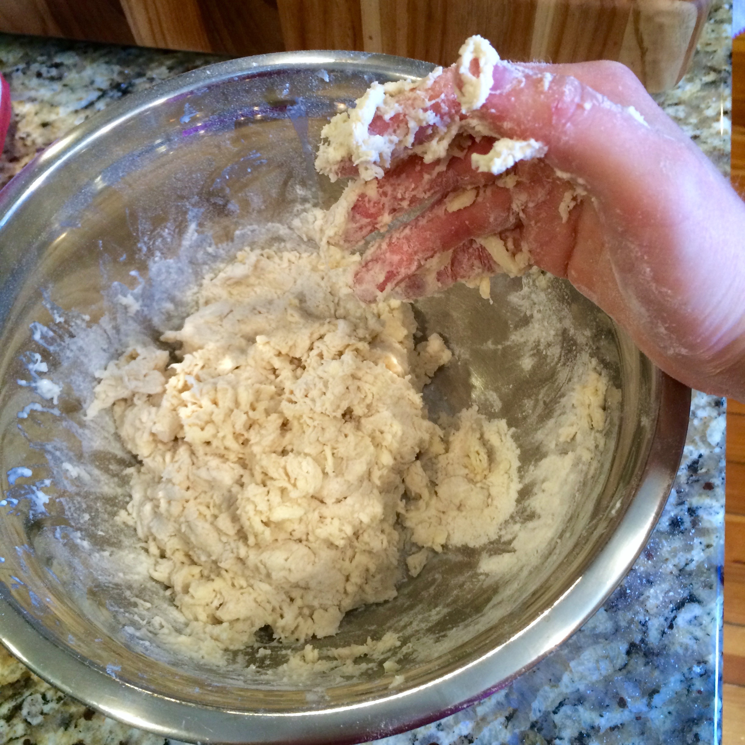 Add the buttermilk and mix with your hands until the batter just begins to form.