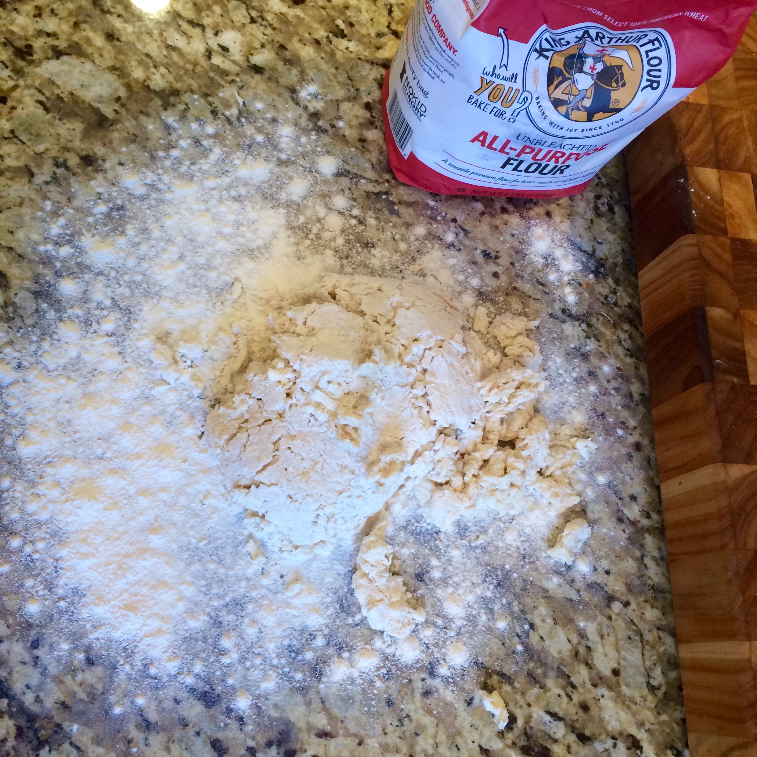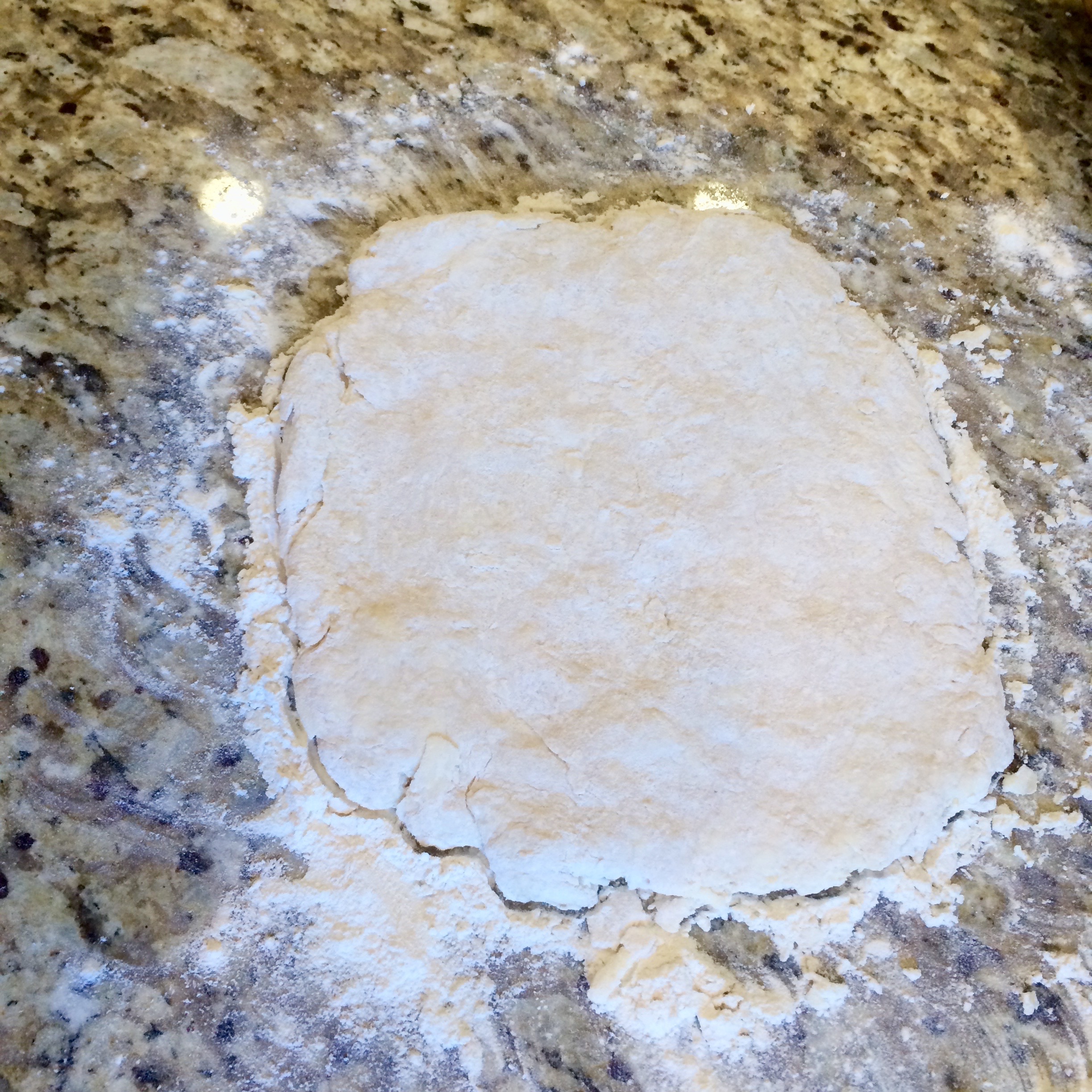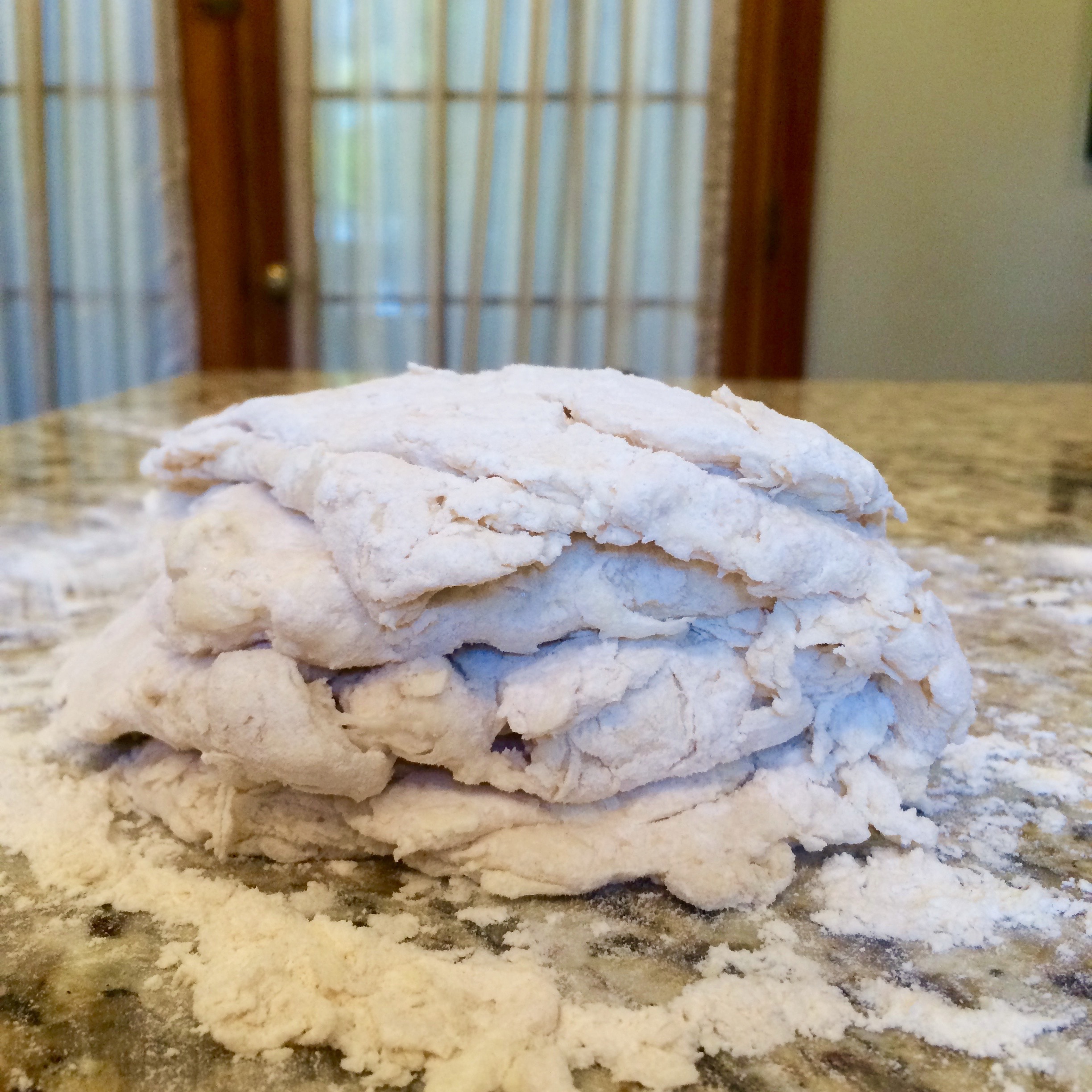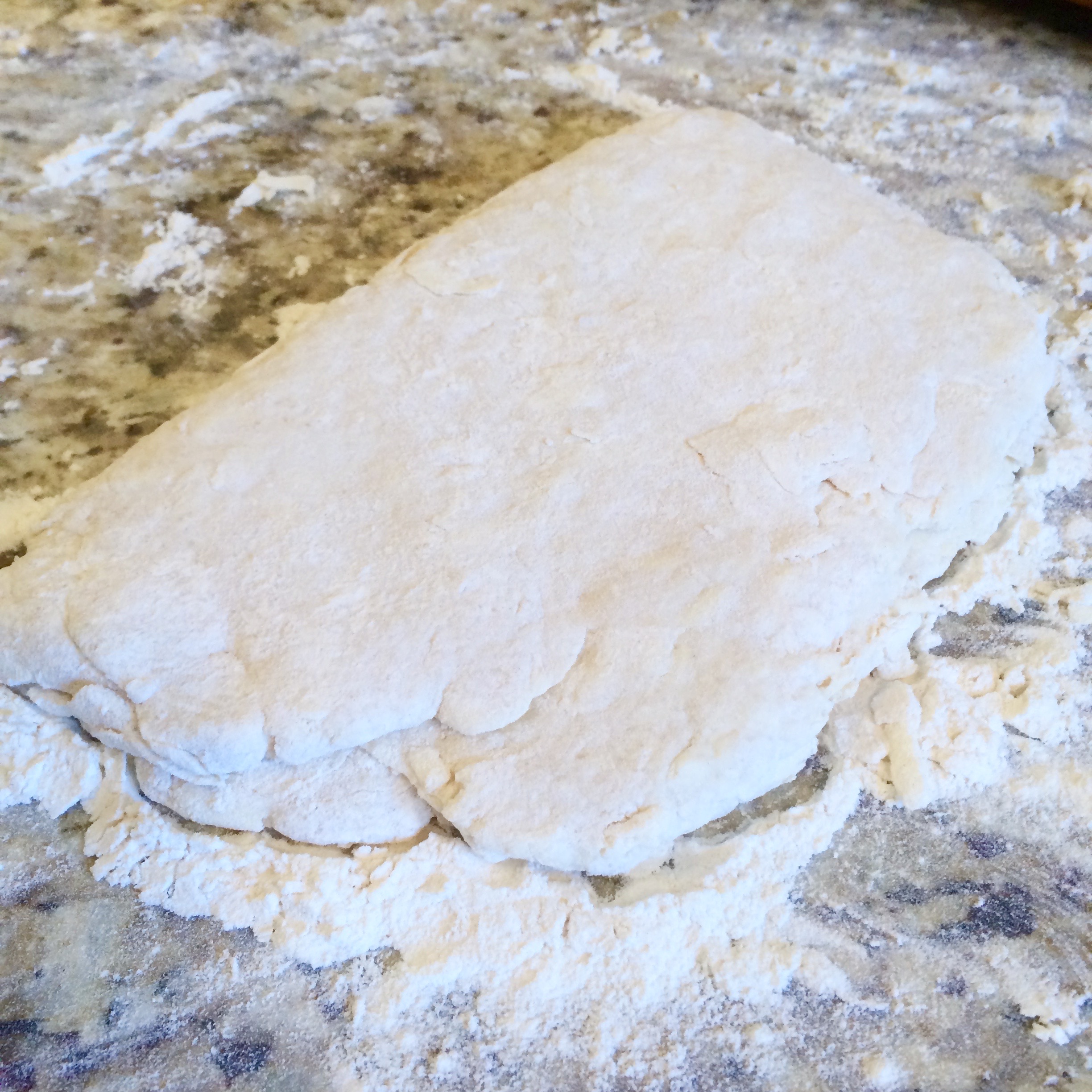 Gently, gently pat the dough until it is about 1/2 inch thick. Fold the dough on itself two times. Pat the dough out again and repeat two more times. Finally, press the dough down so it is about 1/2 inch thick.