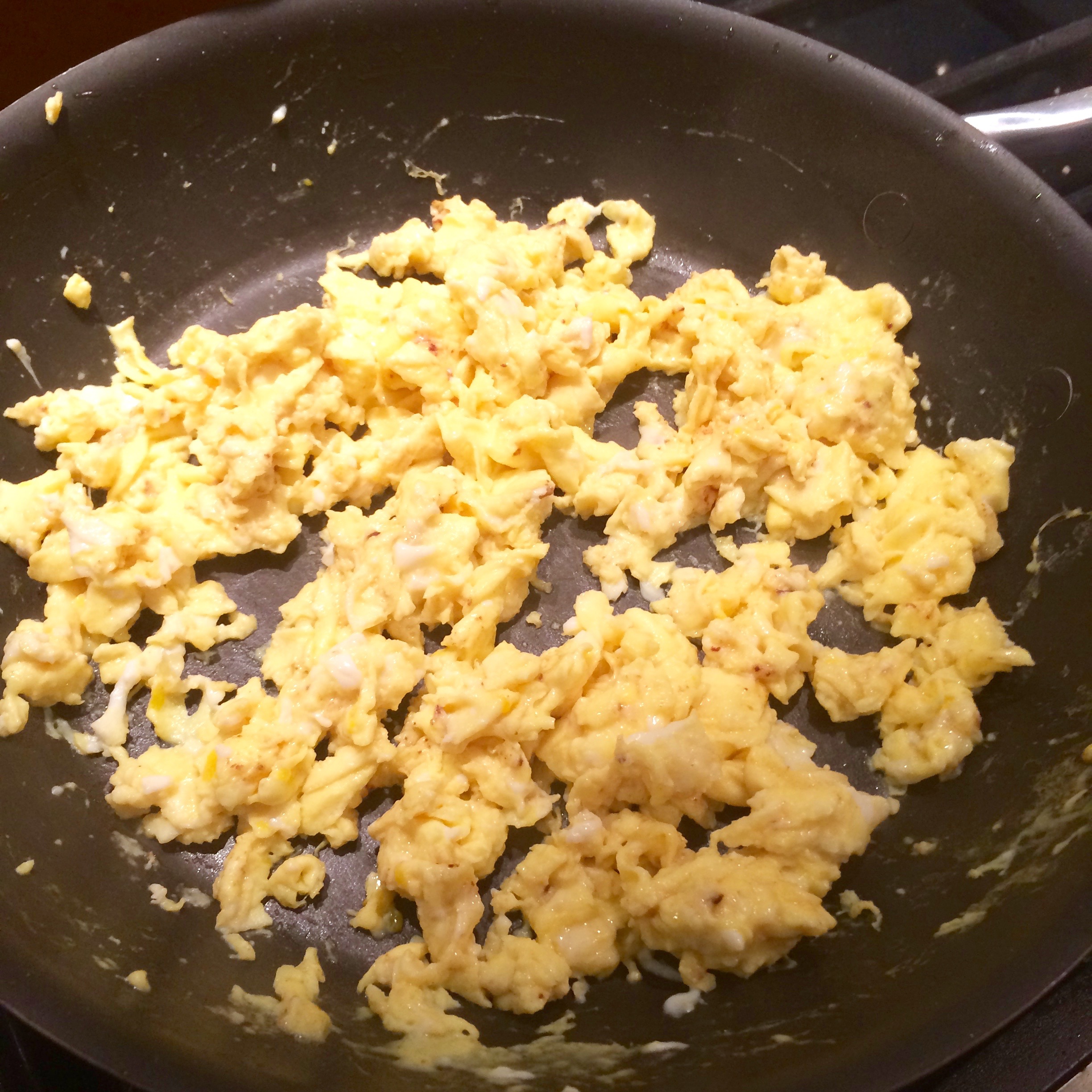 In the pan, scramble up your eggs. I used 1 egg white and 3 eggs, but you can do whatever ratio you prefer.