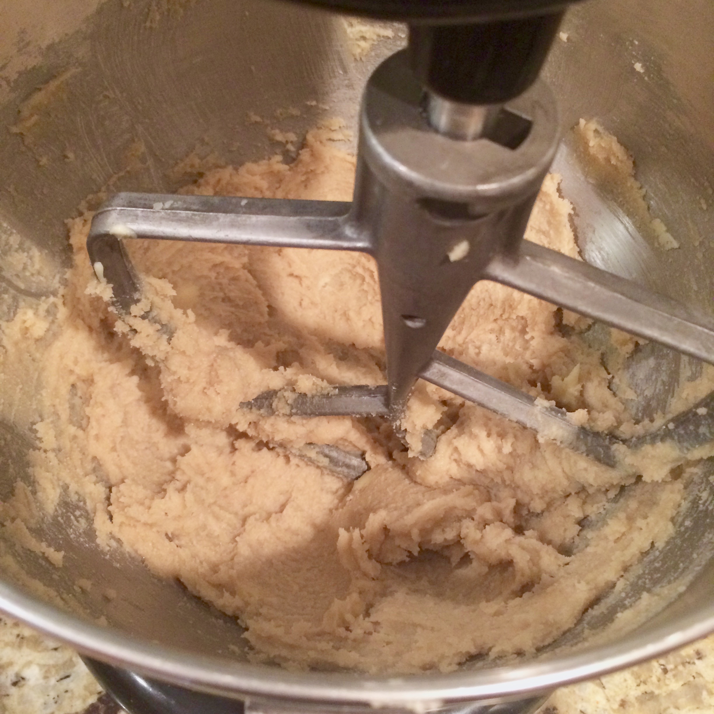 With electric or hand mixer, beat softened butter, brown sugar, and 1/2 cup granulated sugar on medium-high speed until fluffy, a couple of minutes.