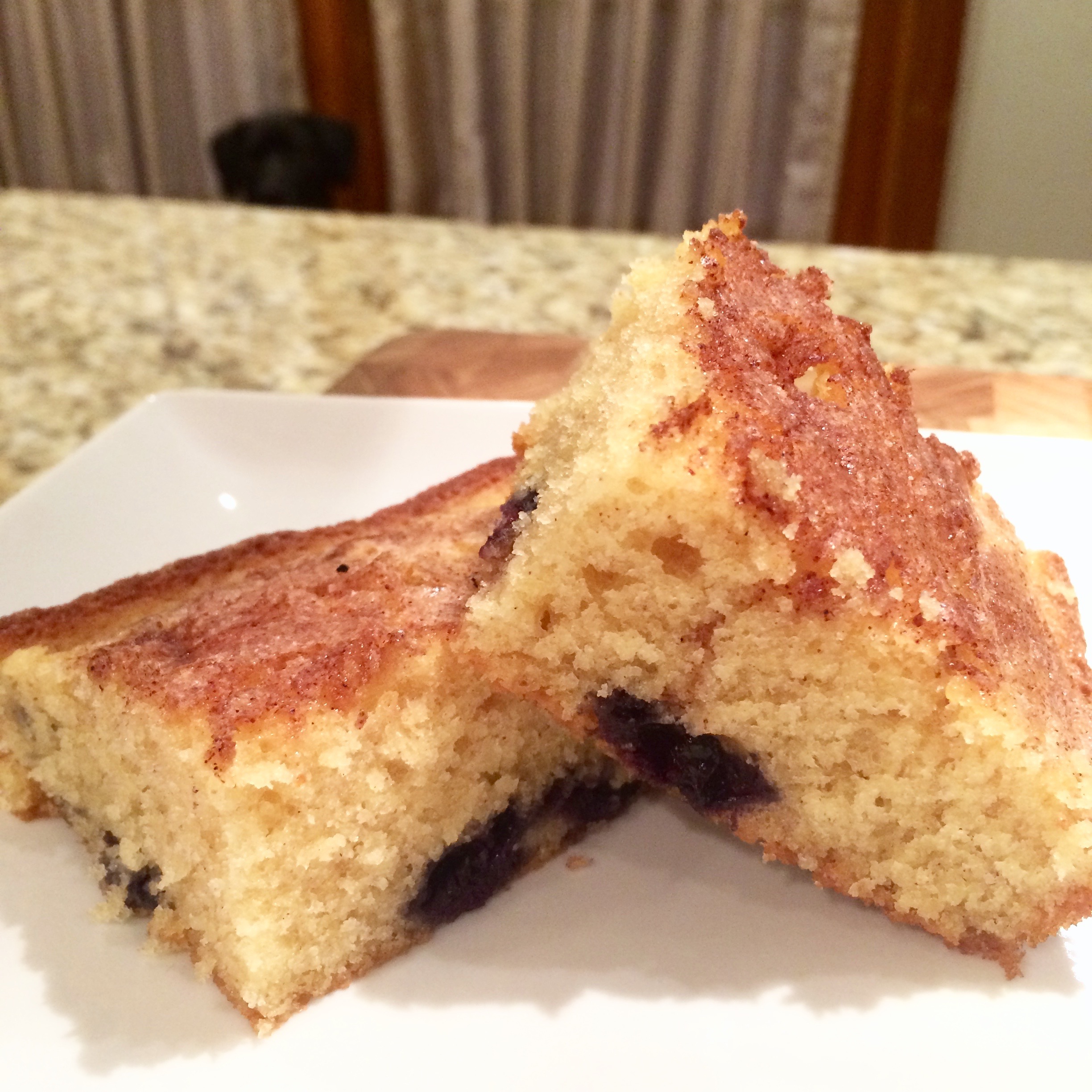 It’s easy to put together and requires mostly pantry ingredients, and I was super impressed with the results. It is reminiscent of a light coffee cake with occasional bursts of blueberry.