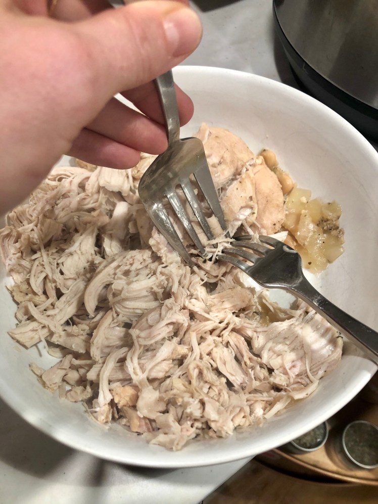 Open the lid and remove the chicken breasts. Shred the meat with two forks.