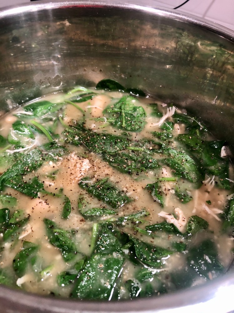 Add the chicken back to the pot. Add in the baby spinach and stir. Let it wilt for a couple minutes.