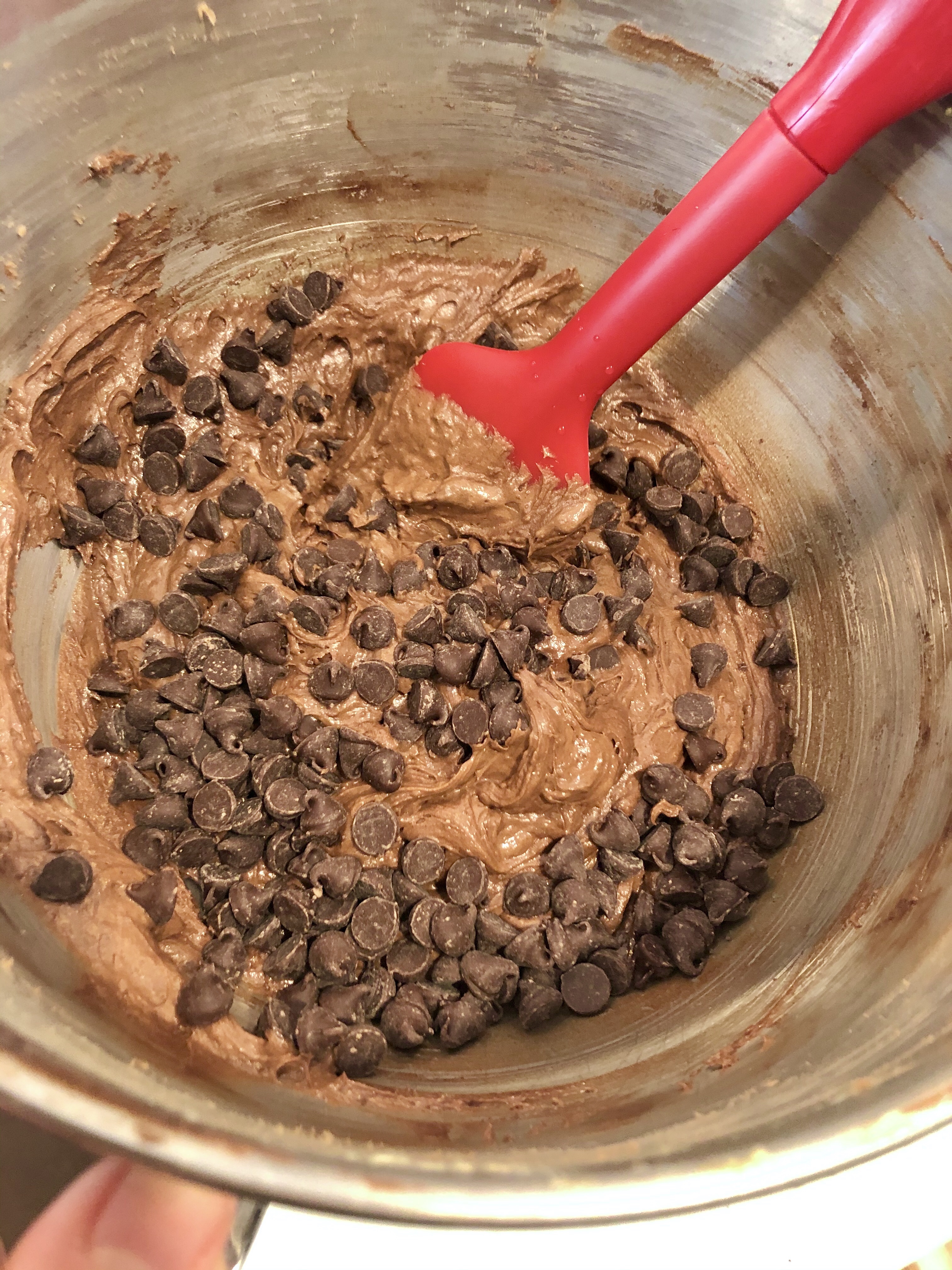 Add in the remaining 5 oz of chocolate chips and mix in, by hand, ever so slightly.