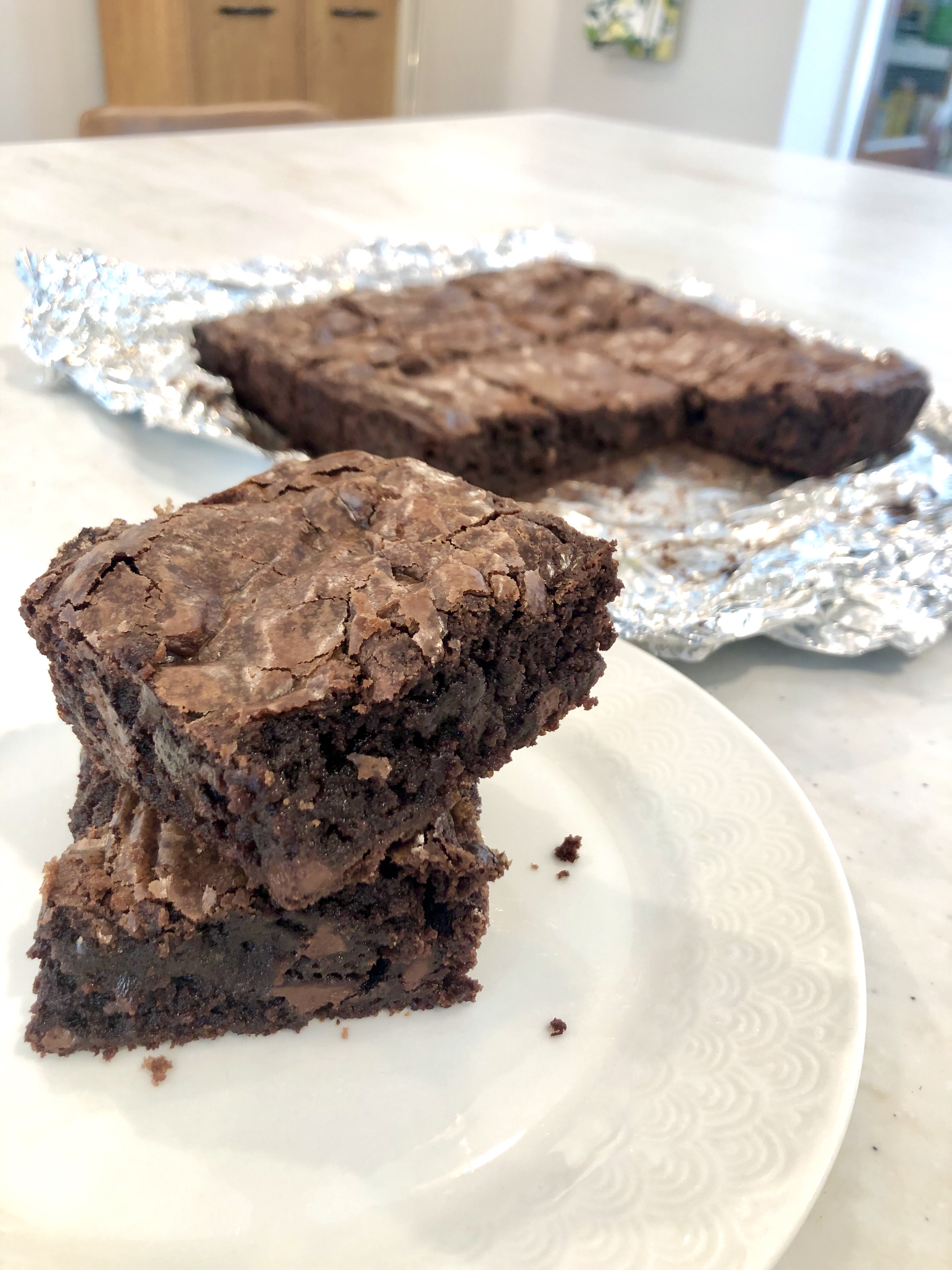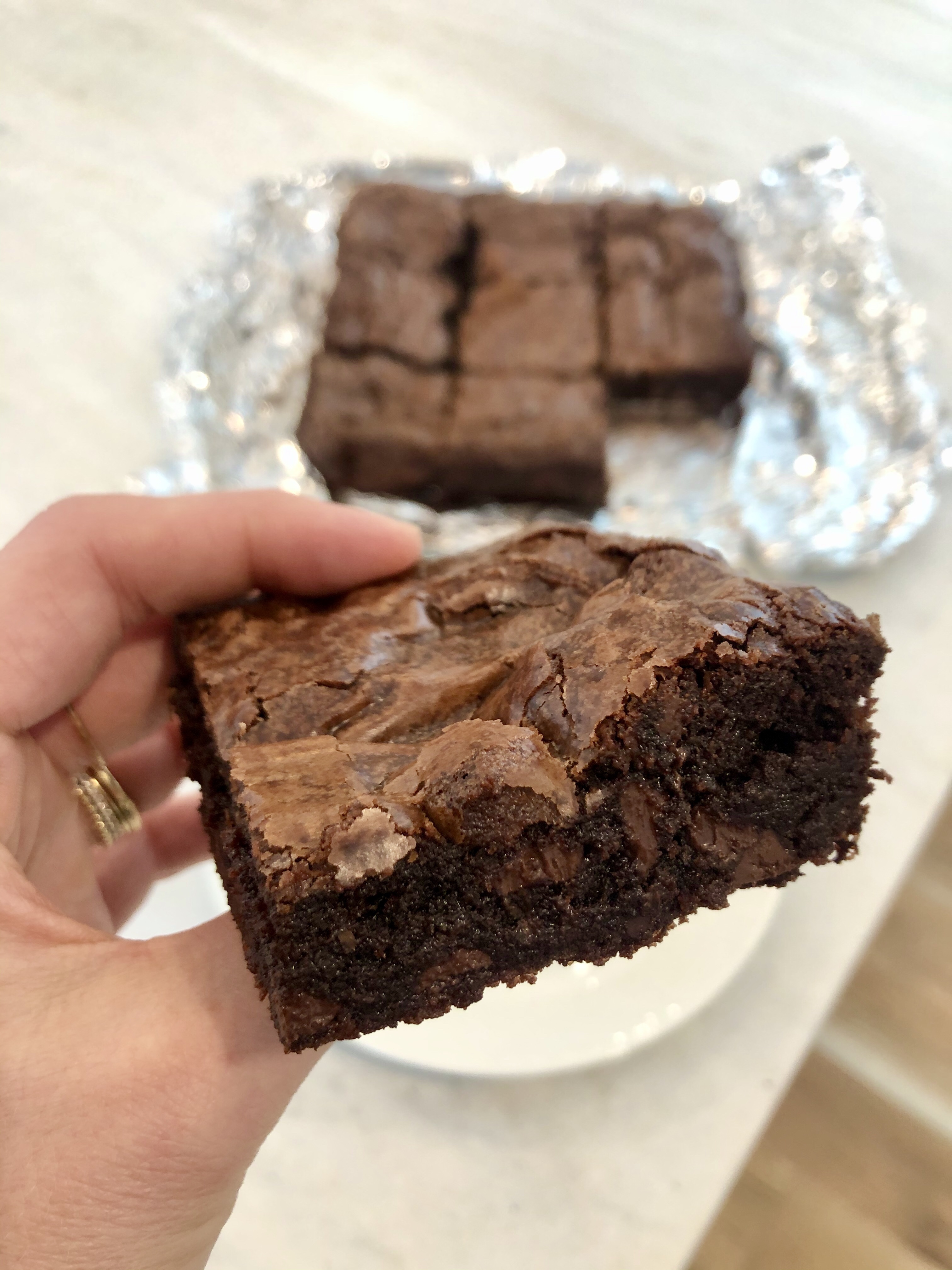 Recently I was jonesing for some classic crinkle top brownies… you know the kind that has a lighter colored top that almost looks paper thin? I found a recipe that had them PLUS the absolute fudgiest center.