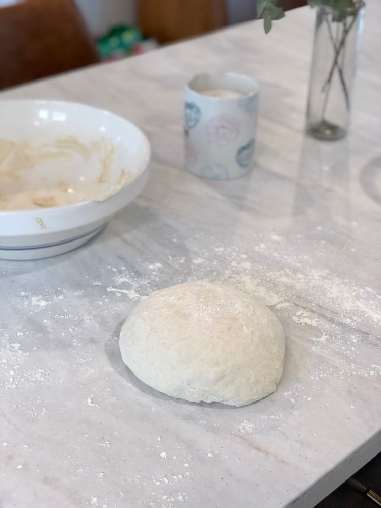 Once doubled in size, dump the dough onto a lightly floured surface and shape into a round. You’ll want to tuck all the ends under the dough giving it a smooth top.