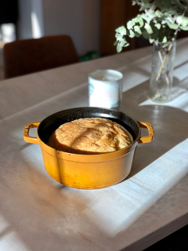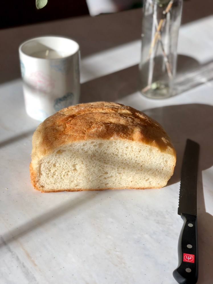 Other than the 4 hours of resting required for this bread, it only requires about a half hour of hands on time. It’s quite simple and tastes fairly plain – but in these times, a quick toast with a smear of butter (and maybe a sprinkle of cinnamon sugar) is giving me lots of comfort. I’m definitely aware how lucky I am to be healthy and safe with a roof over my head and food in my pantry, so I hope this simple bread brings you some comfort during these very strange times.