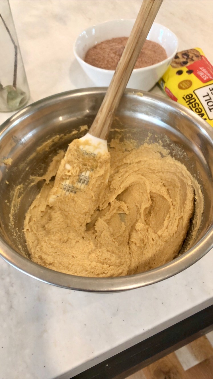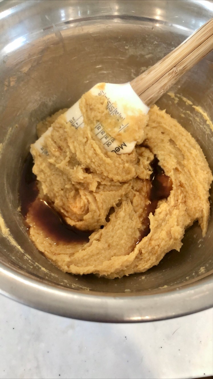 In another medium bowl, mix together the two sugars and incorporate the molasses. I like to use my hands to really blend it nicely. Mix in your softened butter. If you’re using a stand mixer or electric mixer, blend for 3-5 minutes until light and fluffy. Add in your egg and vanilla. If you’re doing this by hand, use your spatula here to mix very thoroughly for 2-4 minutes until the wet mixture is very light and airy.