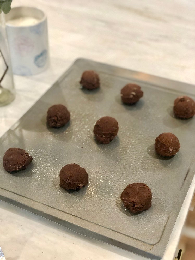 Scoop your dough into 2 tablespoon balls and arrange onto a baking sheet, about 9 per sheet with lots of space between them. You don’t need to flatten them.