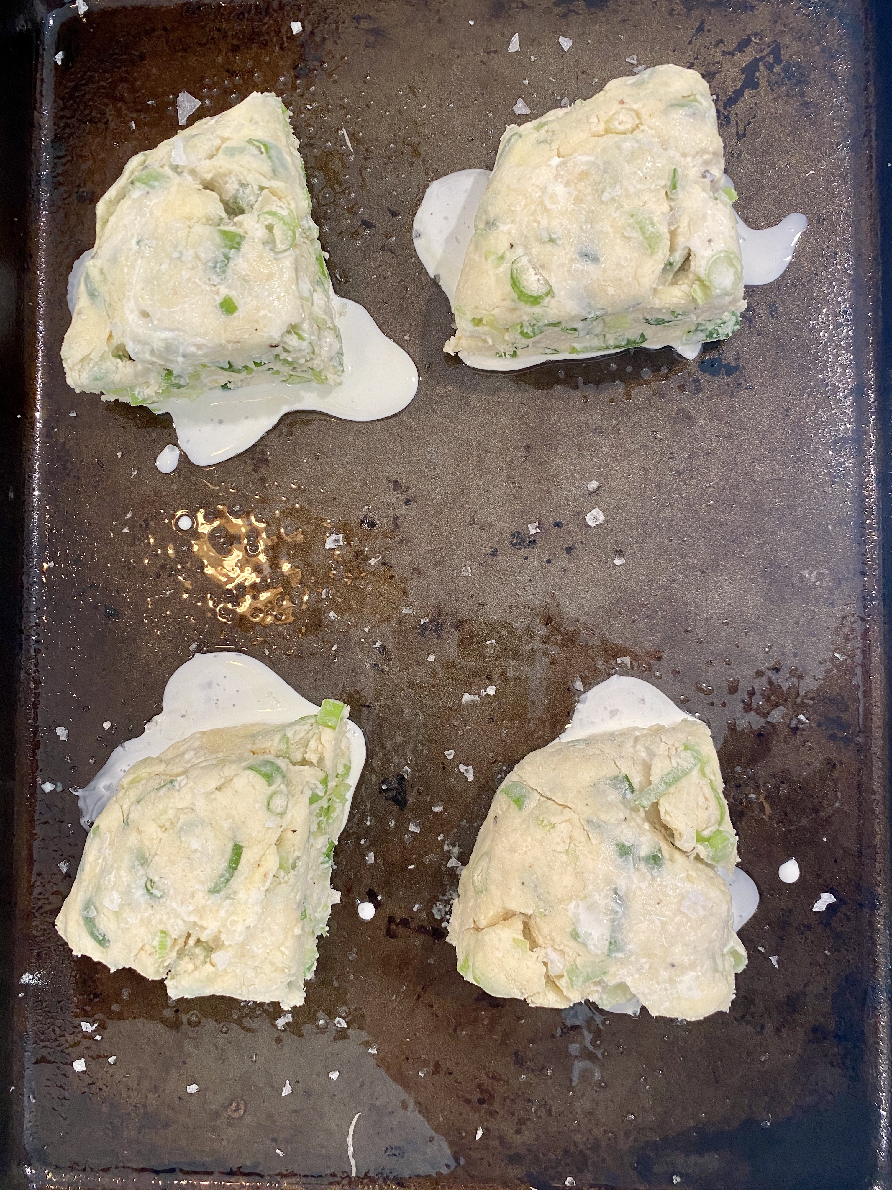 Place on a baking sheet, brush each biscuit with some cream, and then sprinkle with flaky sea salt.