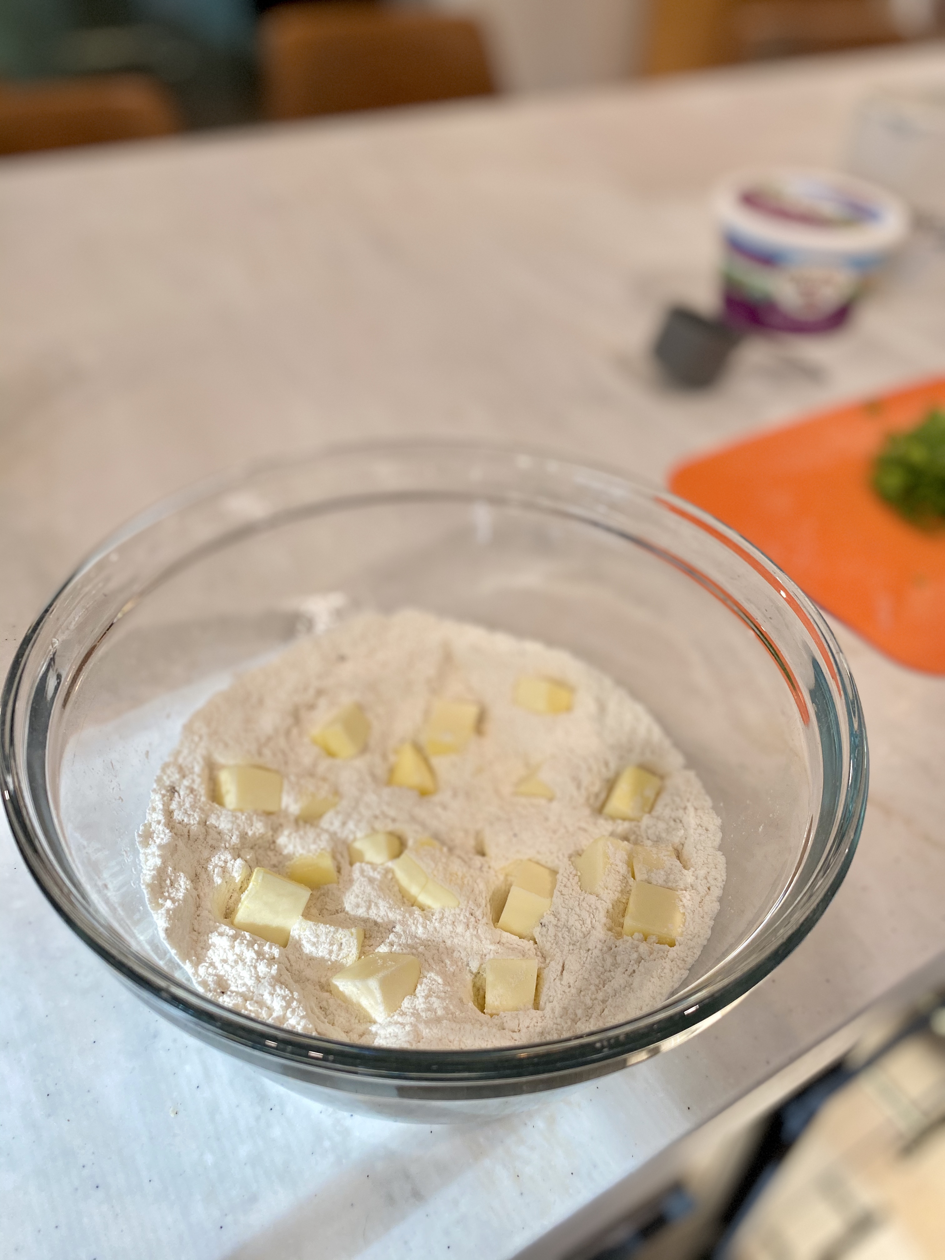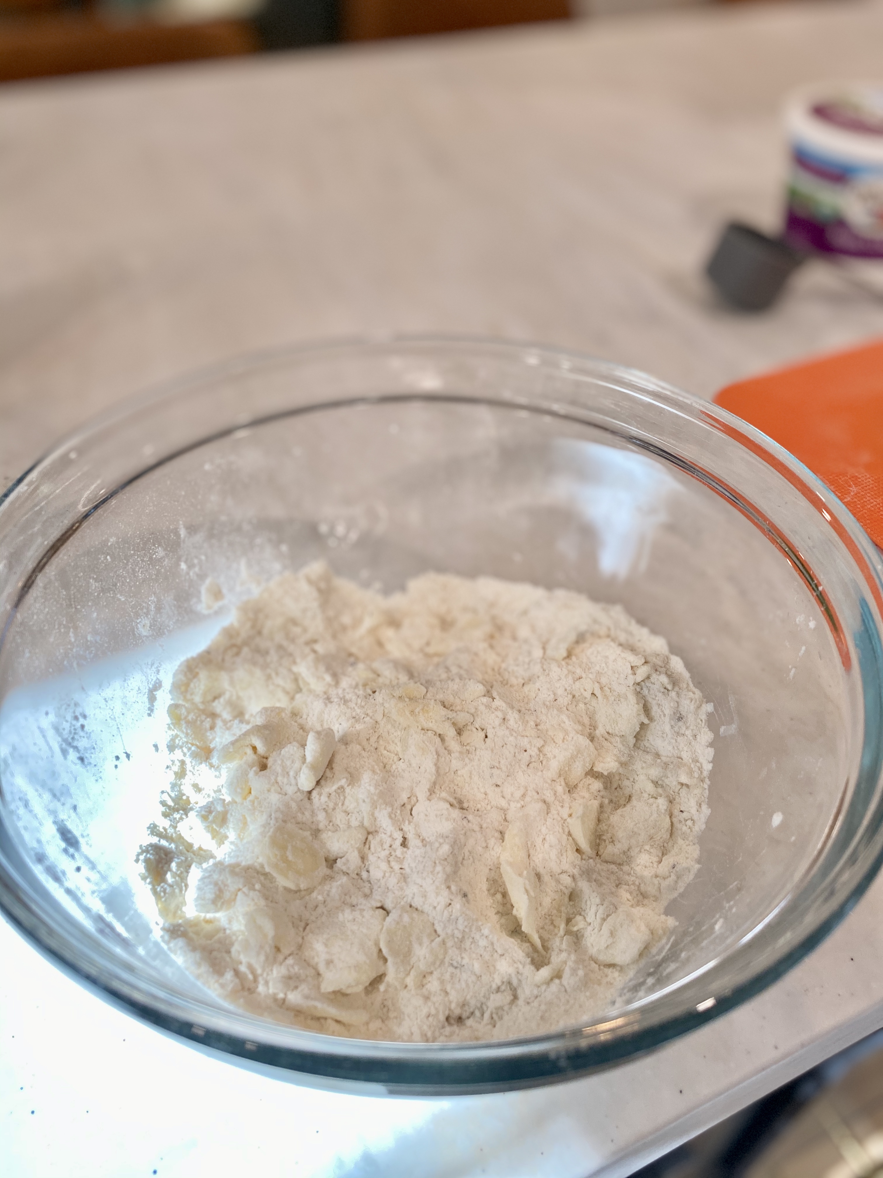 Cut your cold butter into 5-6 pieces and add into the whisked dry ingredients. Using your fingers (or a pastry cutter), pinch the butter into the dough until it’s in about pea-sized pieces and well dispersed.