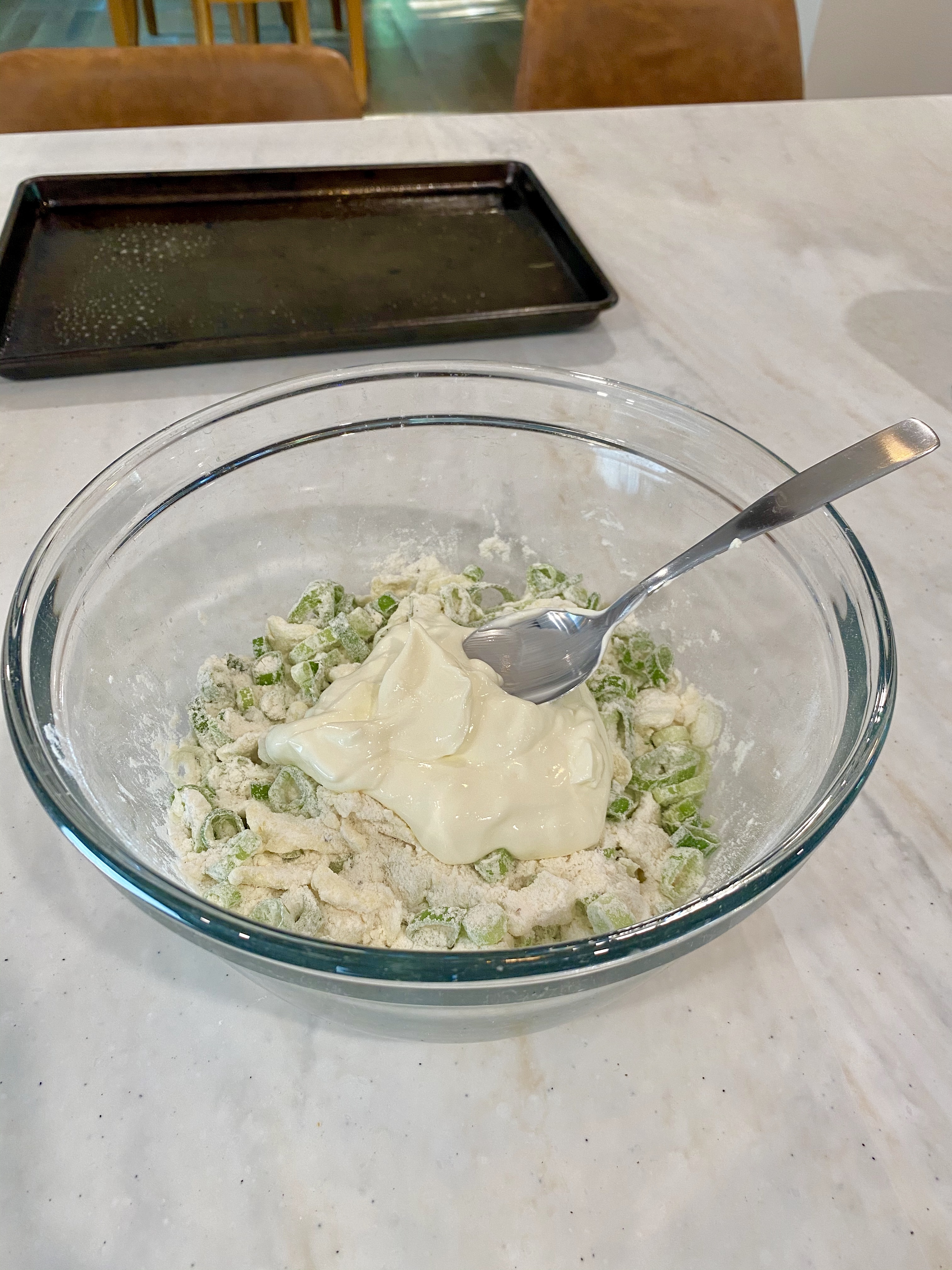 Create a small well in the center of the dough and add in the sour cream. Use a spoon to incorporate it into the dough.