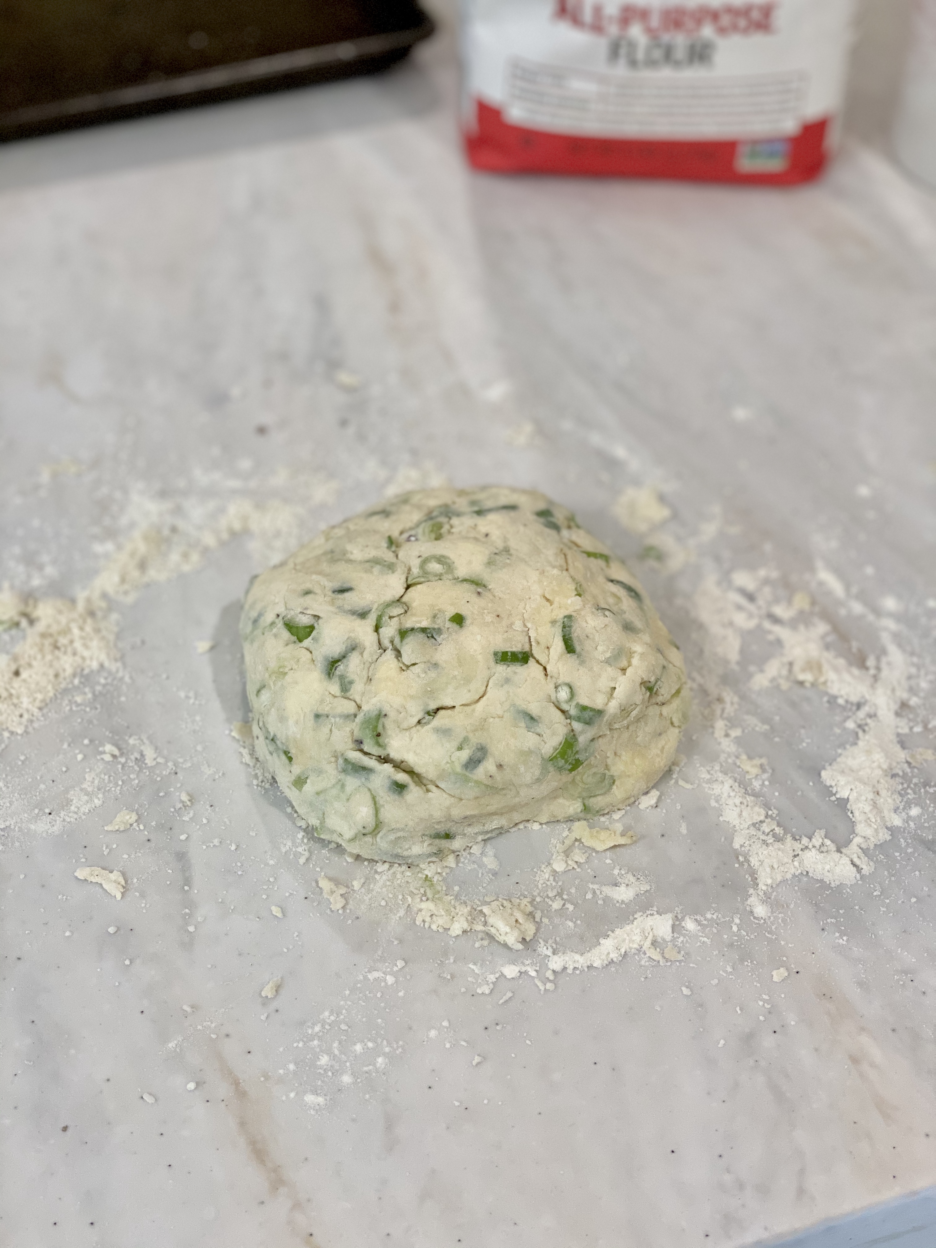 Work the dough into a cohesive piece and then flatten into a rectangle. Fold the rectangle in half and then fold that piece in half. It will get pretty tall at this point. Again, flatten into a rectangle then fold in half two more times. This will help you get delicious layers in your biscuits.