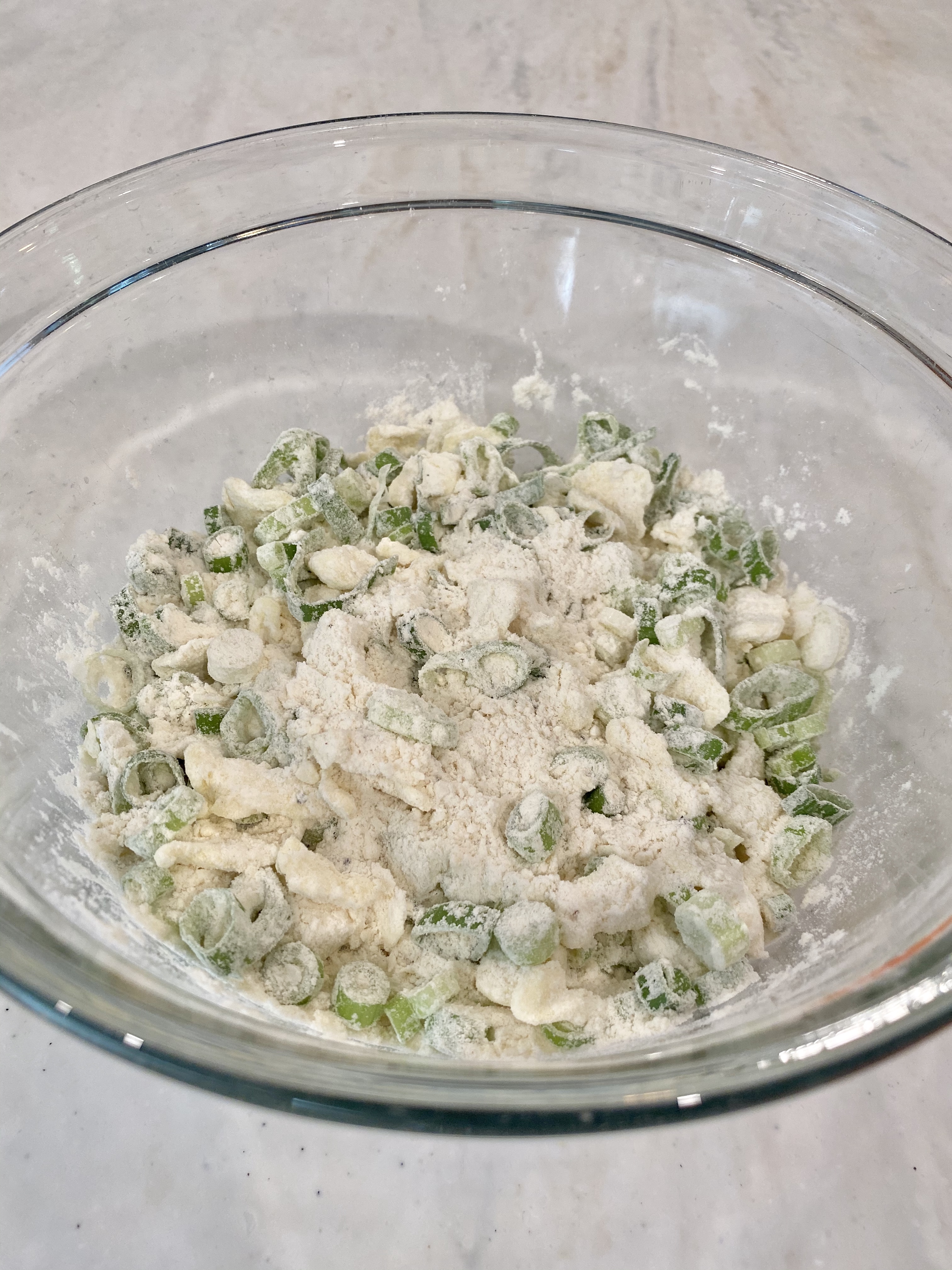 Slice your scallions, including all of the white and green parts, and add into the mixture.