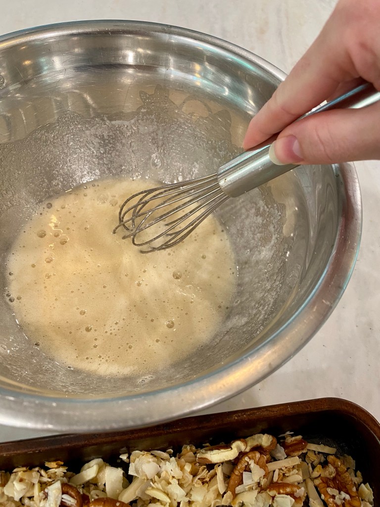 Add the nut mixture into the egg white & sugar. Mix to coat evenly.